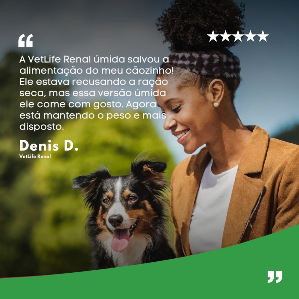 Ofereça ao seu cão a nutrição que ele precisa com a linha Vet Life Renal Wet, especialmente formulada para auxiliar na recuperação de cães adultos com insuficiência renal crônica ou aguda.