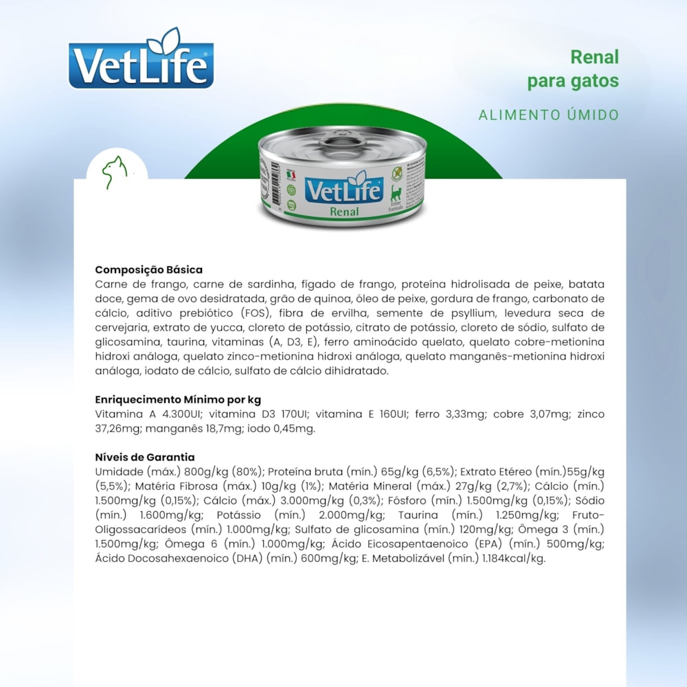 A linha Vet Life Renal Wet oferece nutrição especializada, combinando ciência e ingredientes de alta qualidade para promover a saúde renal e o bem-estar do seu gato.