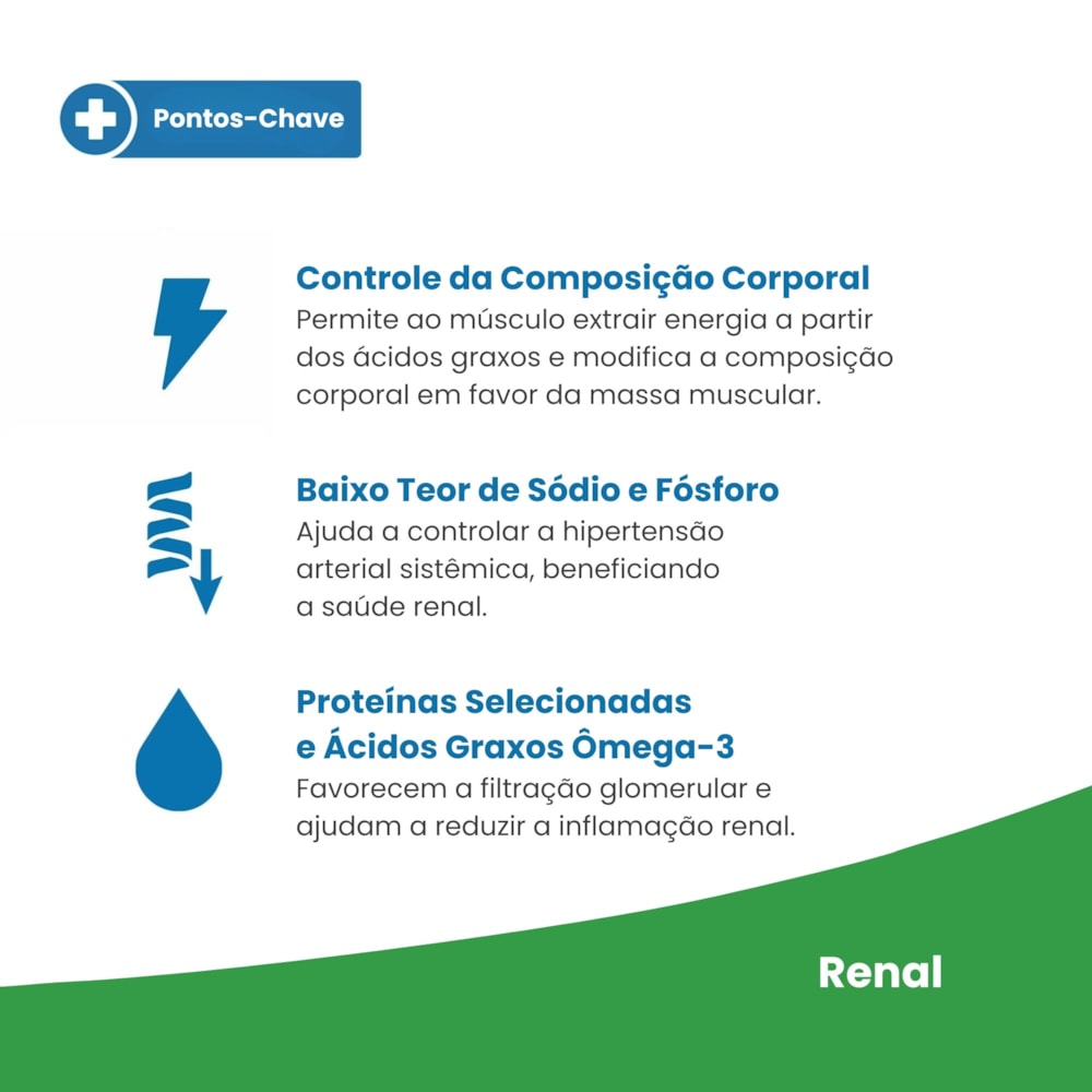 Baixos Níveis de Sódio e Fósforo: A formulação possui baixos conteúdos de sódio e fósforo, contribuindo para a saúde renal.