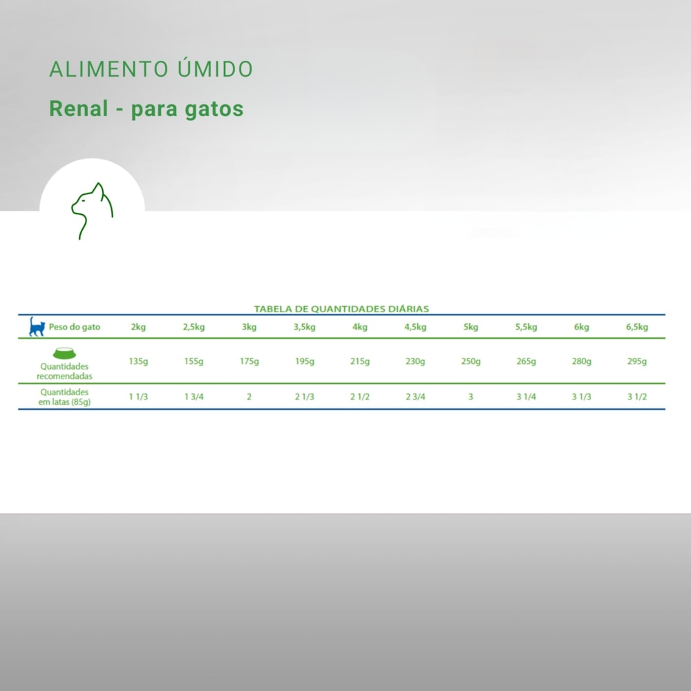 Tipo de produto: Alimento coadjuvante úmido indicado para gatos com doença renal crônica ou aguda.
