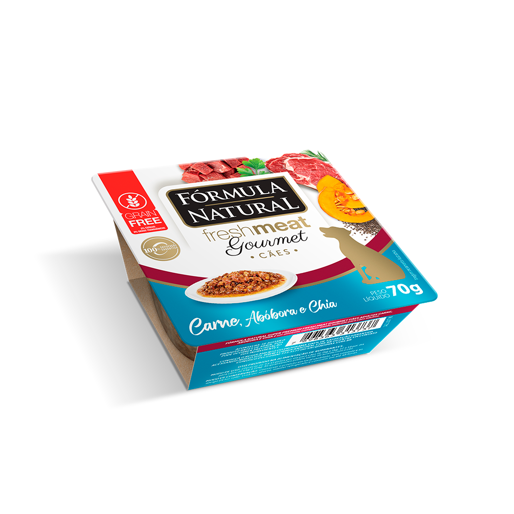 Descrição do produto: A Ração Úmida Fórmula Natural Fresh Meat Gourmet para Cães 70g, no sabor Carne, Abóbora e Chia, é uma opção de alimento delicioso que agrada aos paladares mais exigentes. Completo em nutrientes, pode ser utilizado como alimento principal ou em conjunto com a ração seca. Formulada com carne em pedaços como única fonte de proteína, não possui conservantes e corantes, além de ser livre de grãos. Pelo alto teor de água, colabora ainda para a saúde do trato urinário. Confira mais detalhes do fabricante
