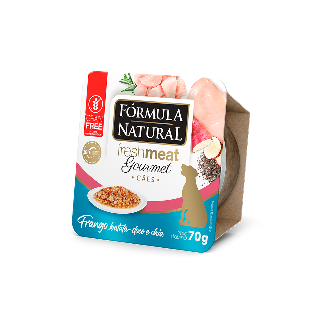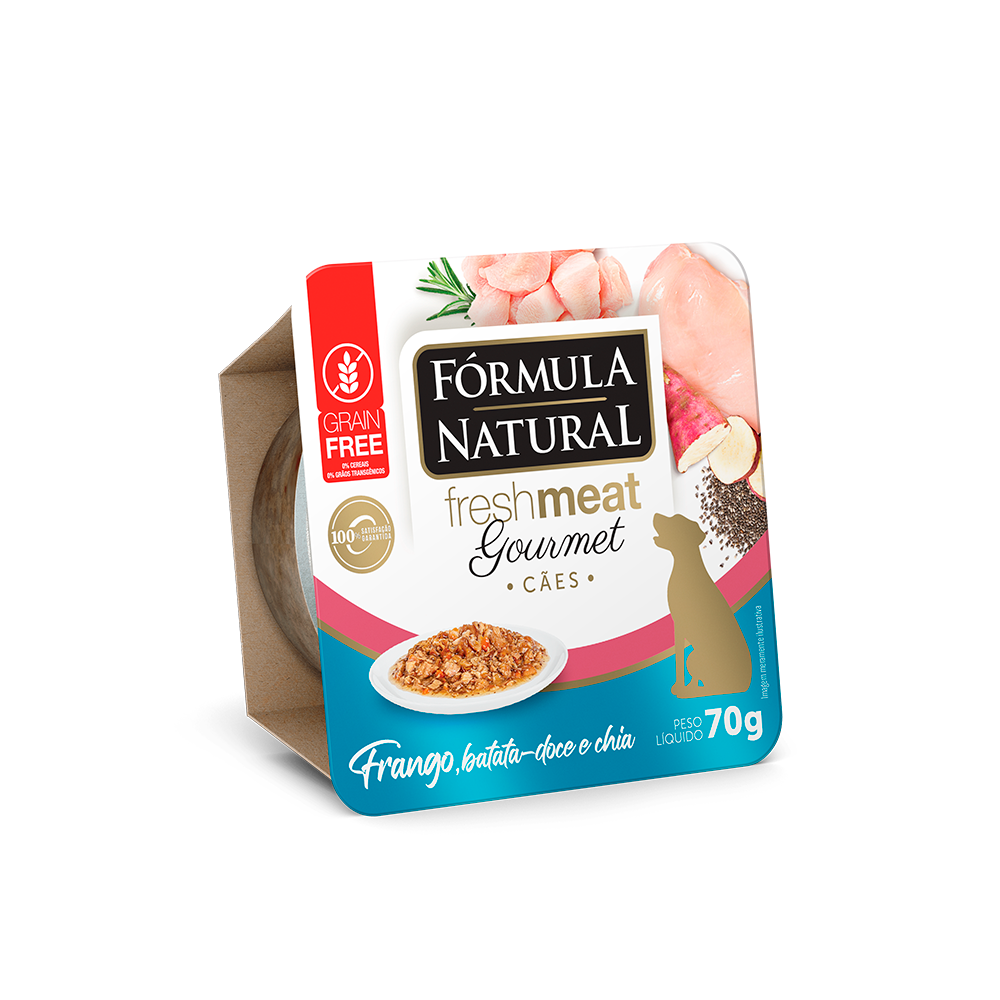 Detalhes do produto: A Ração Úmida Fórmula Natural Fresh Meat Gourmet para Cães 70g, no sabor Frango, Batata-Doce e Chia, é uma opção de alimento delicioso que agrada aos paladares mais exigentes. Completo em nutrientes, pode ser utilizado como alimento principal ou em conjunto com a ração seca. Formulada com carne em pedaços como única fonte de proteína, não possui conservantes e corantes, além de ser livre de grãos. Pelo alto teor de água, colabora ainda para a saúde do trato urinário. Confira mais detalhes do fabricante