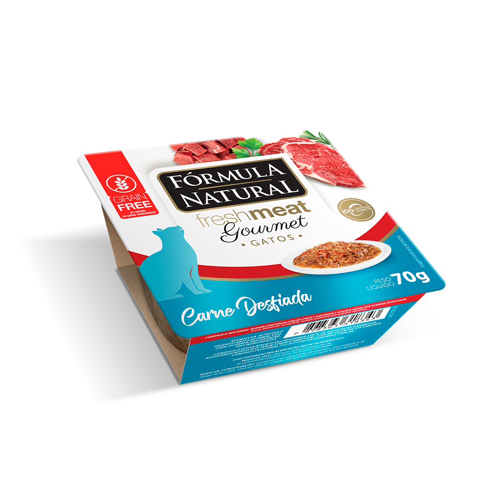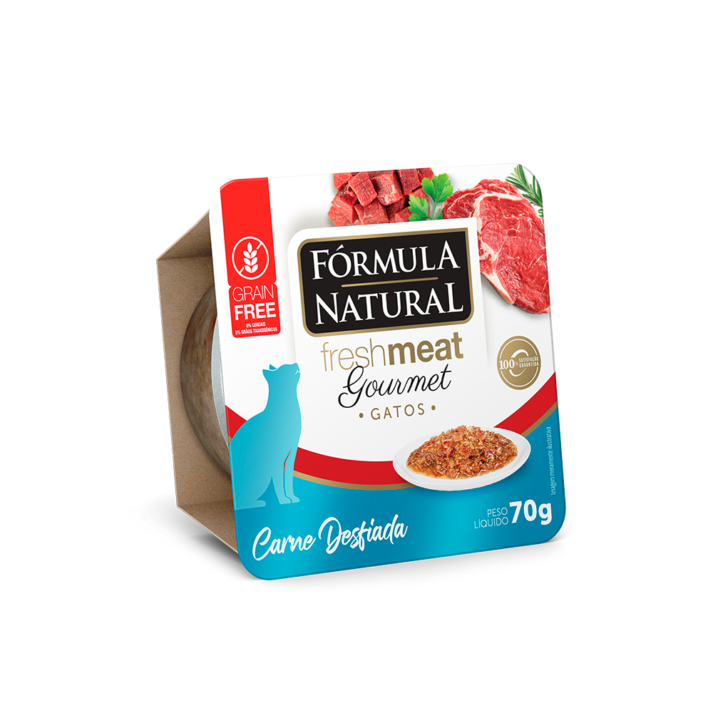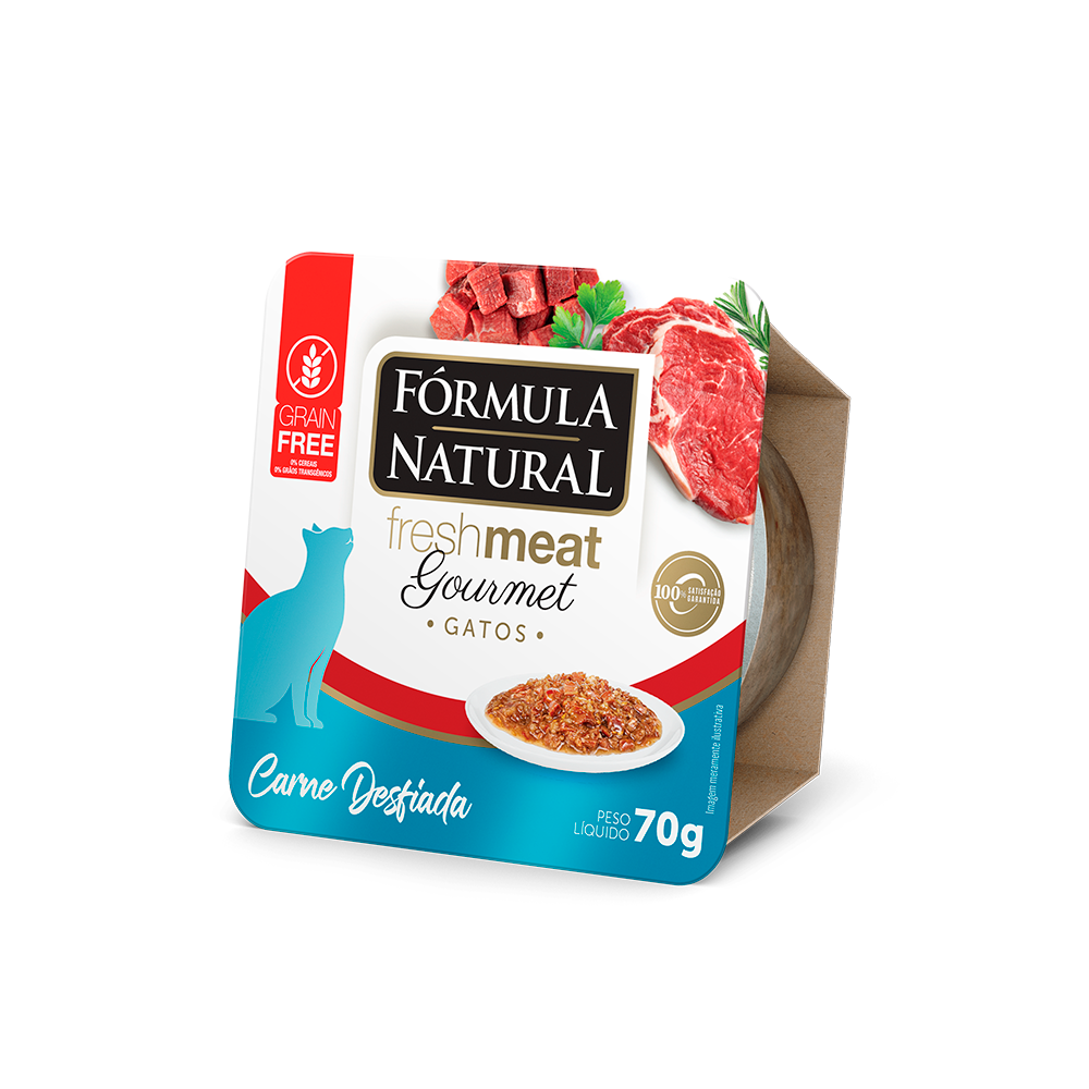Descrição do produto: A Ração Úmida Fórmula Natural Fresh Meat Gourmet para Gatos 70g, no sabor de Carne Desfiada, é um delicioso alimento de alta qualidade que também agrada os paladares mais exigentes. Completa em nutrientes, pode ser utilizada como alimento principal ou em conjunto com a ração seca. Formulada com carne em pedaços como única fonte de proteína, não possui conservantes e corantes, além de ser livre de grãos. Pelo alto teor de água, colabora ainda para a saúde do trato urinário.