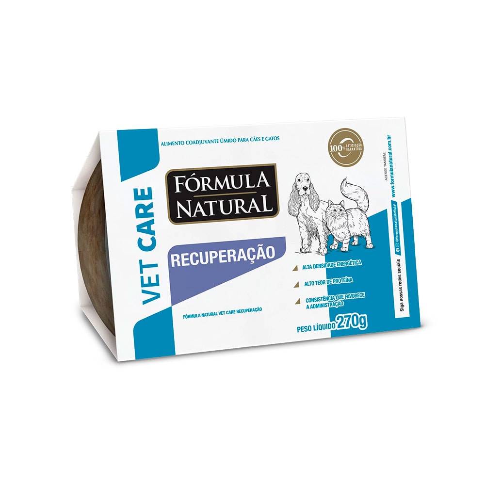 Descrição do produto A Ração Úmida Fórmula Natural Vet Care Recuperação é um alimento coadjuvante desenvolvido para auxiliar cães e gatos no processo de recuperação de condições críticas, como traumas, pós cirúrgico, caquexia, anorexia, hiporexia e convalescência.