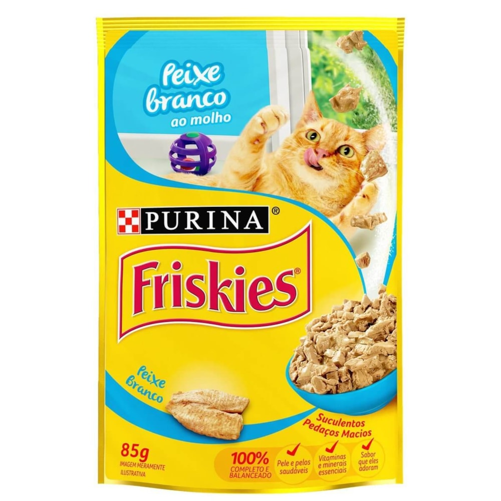 Friskies úmido peixe branco são deliciosos pedaços macios com Peixe Branco ao Molho em um molho delicioso que os gatos adoram! É um alimento 100% completo e balanceado cheio de sabor para alimentar a diversão todos os dias!