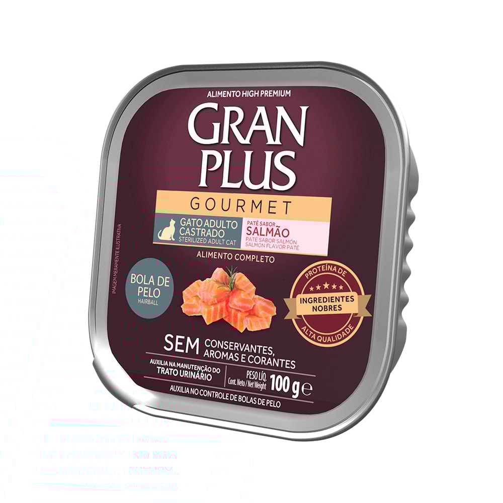 Ração Úmida Gran Plus Patê Gourmet Gatos Adultos Castrados Salmão Anti Bolas de Pelo 100g