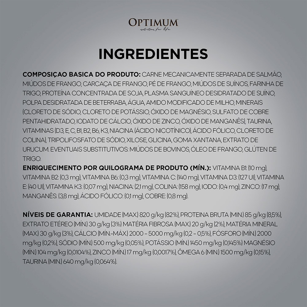 A Ração Úmida Optimum™ Gatos Adultos – Sabor Salmão oferece uma refeição completa e balanceada para gatos adultos de todas as raças. Desenvolvida com o suporte de especialistas em nutrição animal, combina ingredientes de alta qualidade com o sabor irresistível do salmão, promovendo saúde, bem-estar e aceitação elevada.