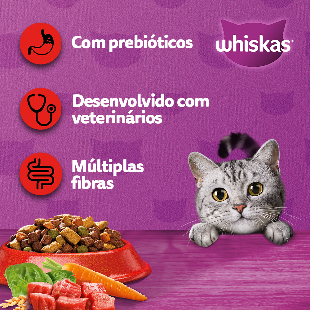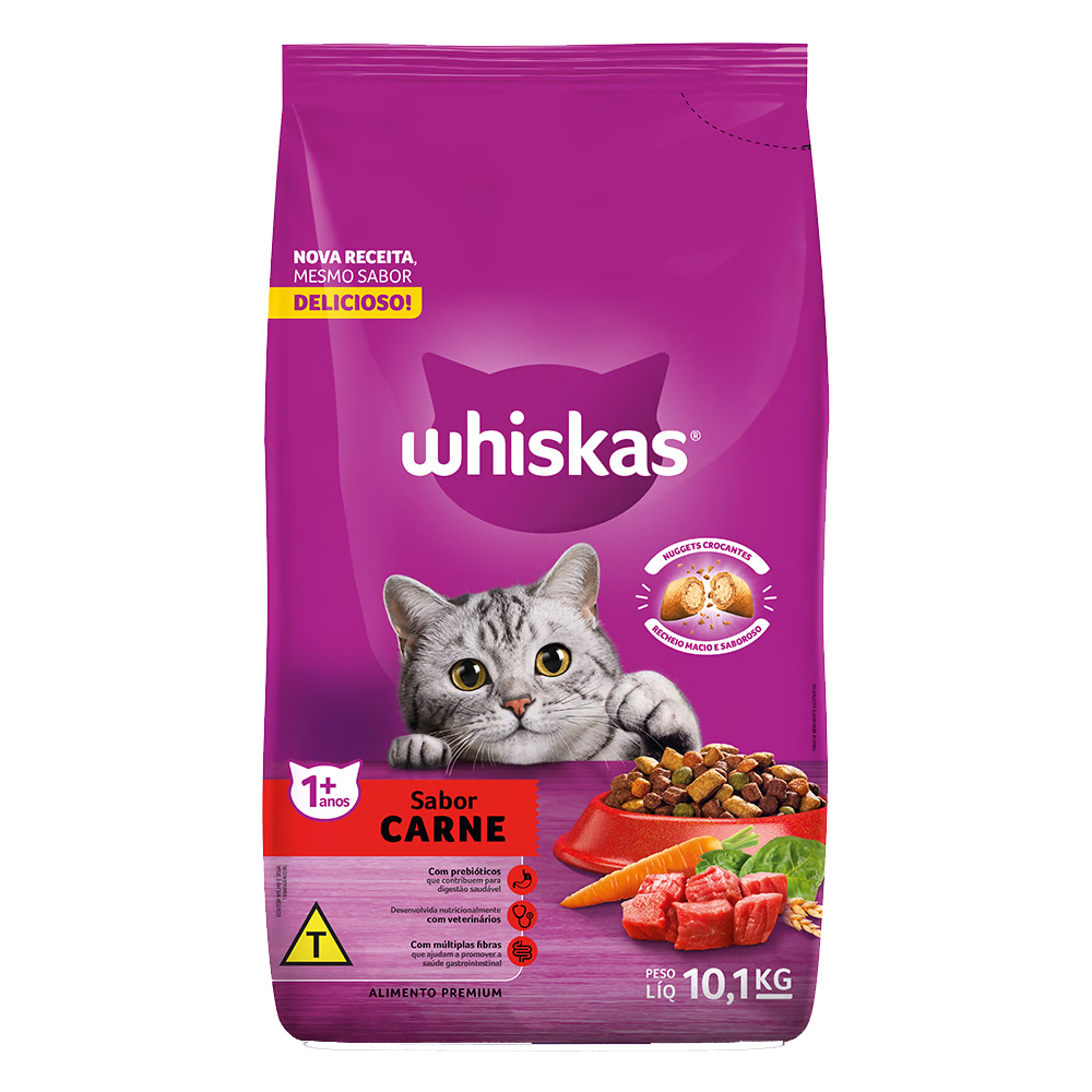 Farinha de Carne e Ossos, Farinha de Subprodutos de Frango, Glúten de Milho*, Glúten de Trigo, Milho Integral Moído*, Quirera de Arroz, Gordura de Frango, Gordura Bovina, Farinha de Trigo, Polpa de Beterraba, Taurina, Metionina, Hidrolisado de Fígado de Frango, Vitaminas (A, B1, B2, B6, B12, D3, E, K3, Ácido Fólico, Niacina, Biotina, Cloreto de Colina, Ácido Pantotênico), Minerais (Cloreto de Sódio – sal comum –, Cloreto de Potássio, Iodato de Cálcio, Óxido de Zinco, Selenito de Sódio, Sulfato de Cobre, Sulfato de Manganês), BHT, Corantes (Caramelo, Dióxido de Titânio). Eventuais substitutivos: Celulose em pó, Sorgo em grão, Óleo de milho*. *Espécies doadoras do gene: Agrobacterium tumefaciens, Bacillus thuringiensis, Streptomyces viridochromogenes, Zea mays.