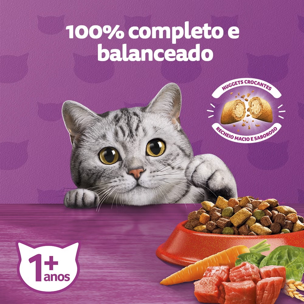 O Ração Whiskas Para Gatos Adultos Sabor Carne 900g é um alimento completo e balanceado, desenvolvido para atender às necessidades nutricionais de gatos adultos.
