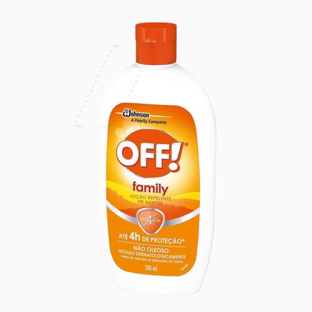 Detalhes do Produto OFF!® Family Loção é dermatologicamente testado e foi desenvolvido para ser usado por toda a família (crianças acima de 2 anos). Sua fórmula não oleosa, possui Aloe Vera e protege por 4 horas, garante proteção contra mosquitos, inclusive contra o aedes aegypti, mosquito que pode transmitir o Zika vírus, a Dengue, a febre Chikungunya e a Febre Amarela.