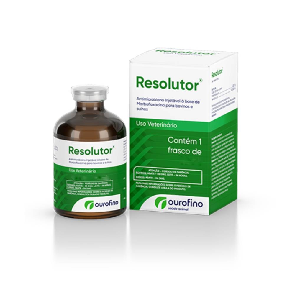 Detalhes do Produto Resolutor® é indicado para o tratamento das doenças infecciosas bacterianas em bovinos e suínos causadas por agentes Gram-positivos e Gram-negativos sensíveis à Marbofloxacina. Em bovinos, os agentes etiológicos susceptíveis ao Resolutor® são: Dichelobacter nodosus, Mannheimia haemolytica, Pasteurella multocida, Staphylococcus aureus, Streptococcus pyogenes e Fusobacterium necrophorum. Já em suínos, os agentes etiológicos susceptíveis são: Mycoplasma hyopneumoniae, Actinobacillus pleuropneumoniae, Actinobacillus suis, Bordetella bronchiseptica, Haemophilus parasuis, Escherichia coli, Erysipelothrix rhusiopathiae, Salmonella enterica sorovar Typhimurium, Streptococcus suis, Pasteurella multocida e Staphylococcus hyicus.