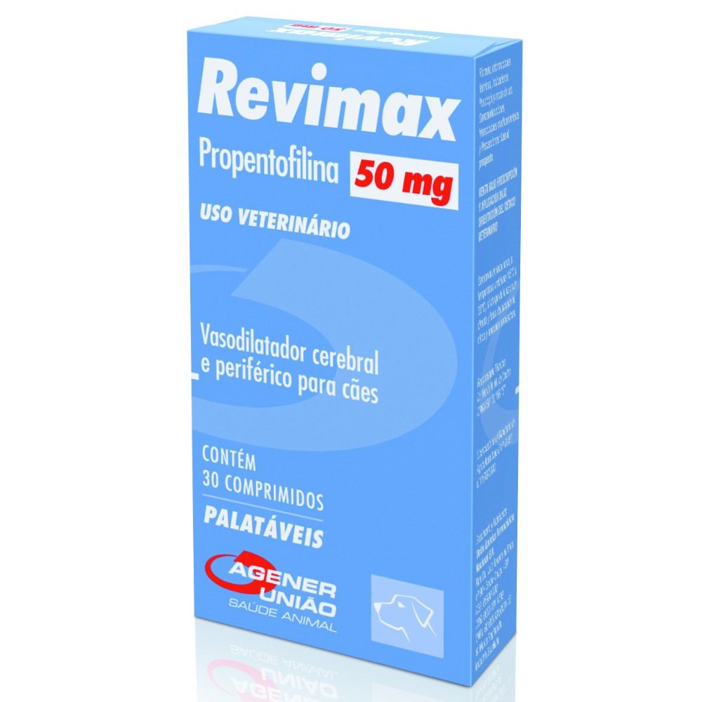 Descrição: Revimax está indicado para o tratamento das afecções decorrentes da má circulação cerebral e periférica, melhorando a qualidade de vida do paciente geriátrico. O medicamento aumenta o fluxo sanguíneo cerebral e atua diretamente contra o processo neurodegenerativo, melhorando as funções cognitivas e reduzindo as alterações comportamentais do animal senil. Vasodilatador central e periférico para cães à base de propentofilina e de uso oral.