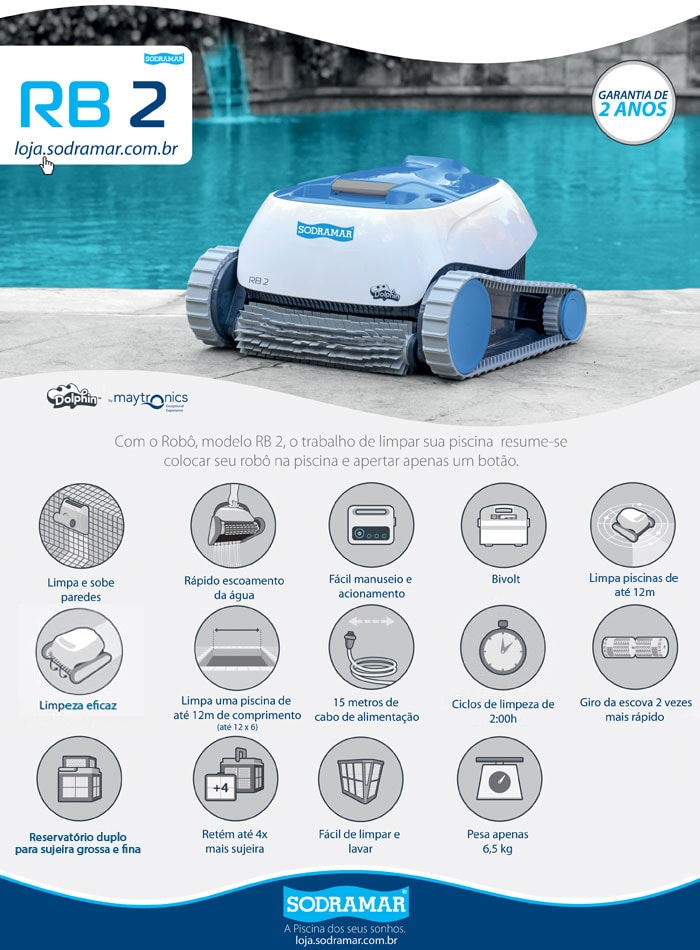 O Robô para limpeza RB2 Sodramar traz o que há de mais moderno no mercado mundial diretamente para sua Piscina, com ele o trabalho de limpeza da sua piscina resume-se em colocar o Robô na água e apertar apenas um botão. Ele é capaz de aspirar e escovar totalmente uma piscina de até 12m de comprimento em até 2 horas, seu filtro interno possui alta capacidade de retenção de sujeiras e micro partículas, sua escovação é muito eficiente pois sua escova gira 2 vezes mais rápido do que sua esteira, proporcionando uma limpeza perfeita de paredes e piso da piscina.