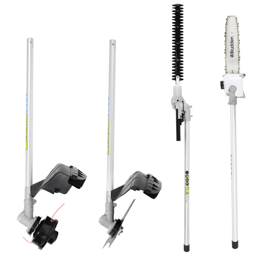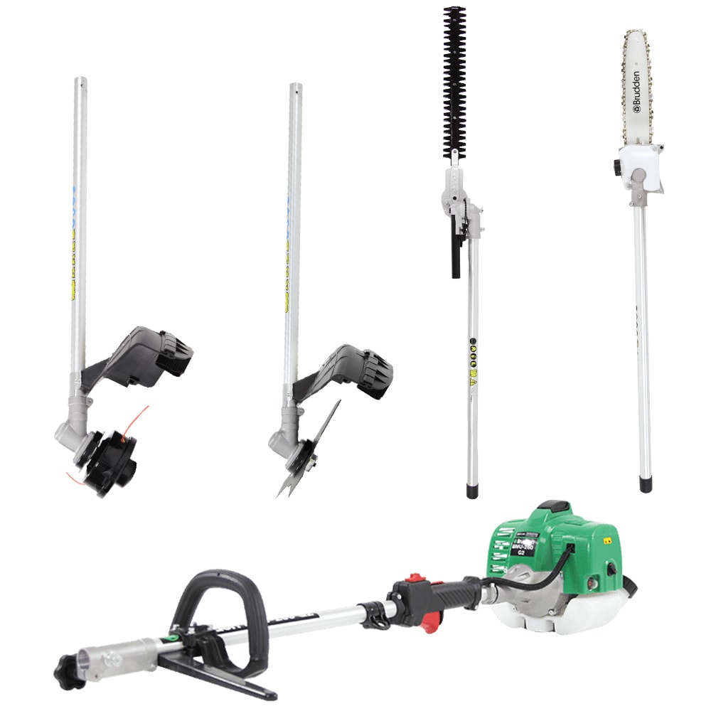 Acompanha chave, cinto, misturador de combustível, haste de cerca viva, haste de roçar, haste de poda, lâmina três pontas e carretel de nylon