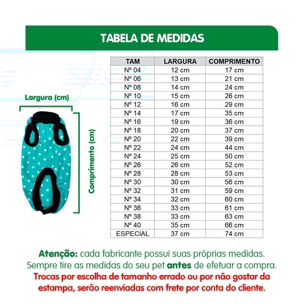 ATENÇÃO: Trocas por erro de tamanho ou por não gostar da estampa, serão reenviadas com frete por conta do cliente.