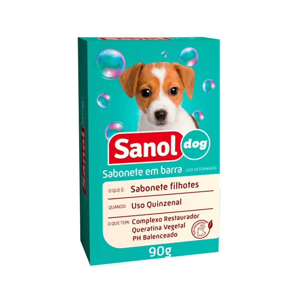Detalhes do Produto O Sabonete em Barra Sanol Dog para Filhotes 90 g é indicado para cães e gatos de todas as raças. Sua fórmula balanceada limpa e fortalece o pelo de maneira segura, proporcionando ao animal sensação de limpeza e agradável perfume.