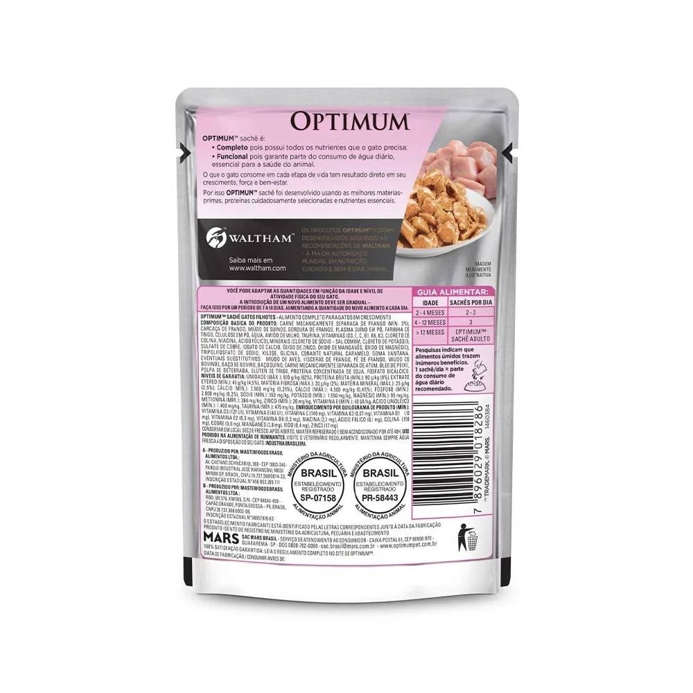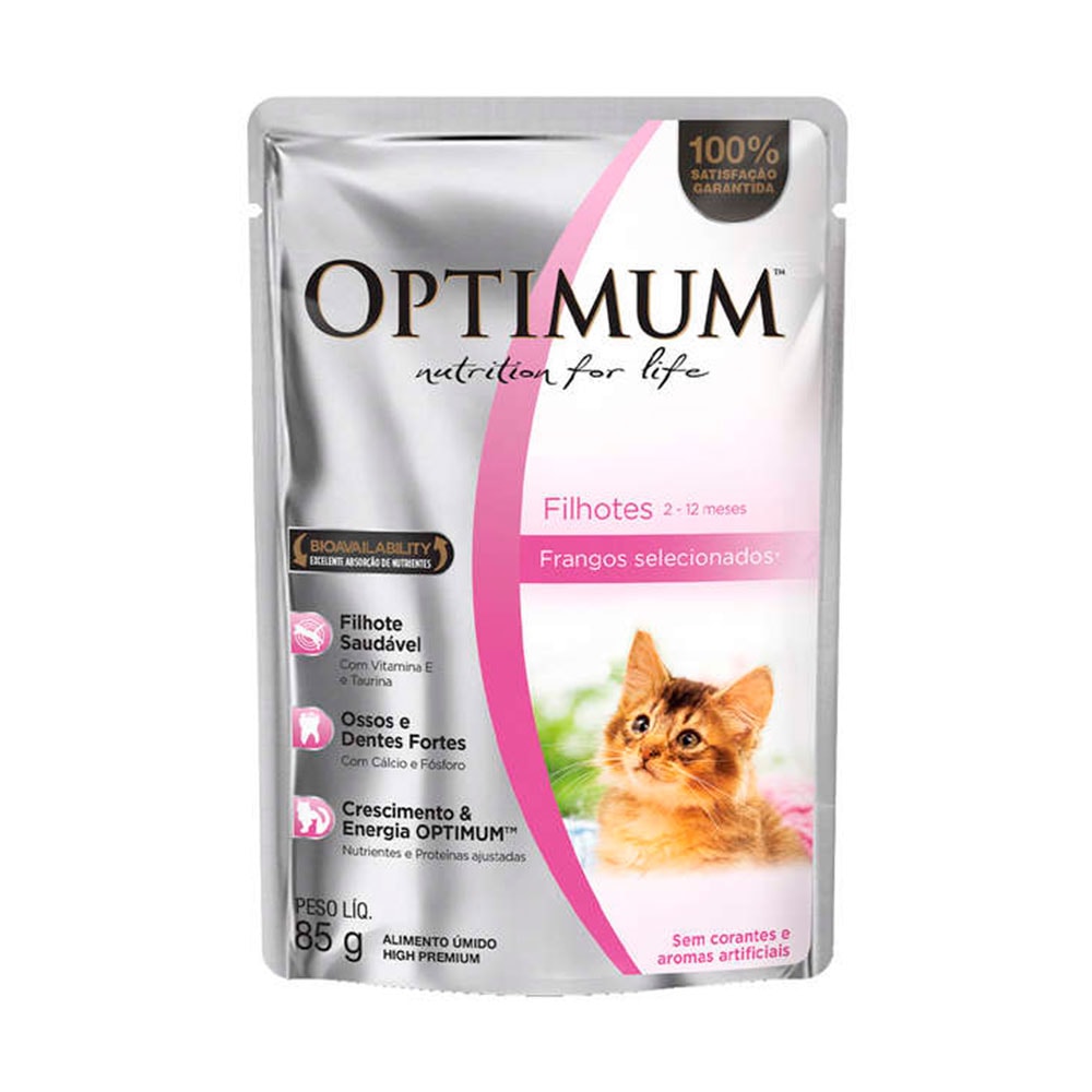 O Optimum Sachê Sabor Frangos Selecionados 85g foi desenvolvido especialmente para gatos filhotes (de 2 a 12 meses de idade), com vitamina E taurina, além de outros nutrientes essenciais para a fase de crescimento de felinos. Possui também cálcio e fósforo para o desenvolvimento de ossos e dentes saudáveis, além de garantir parte do consumo de água diário de ideal para a saúde do gato e segue as recomendações da Waltham – a maior autoridade mundial em nutrição, cuidado e bem-estar animal.