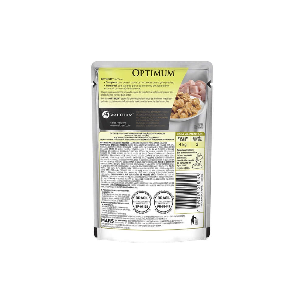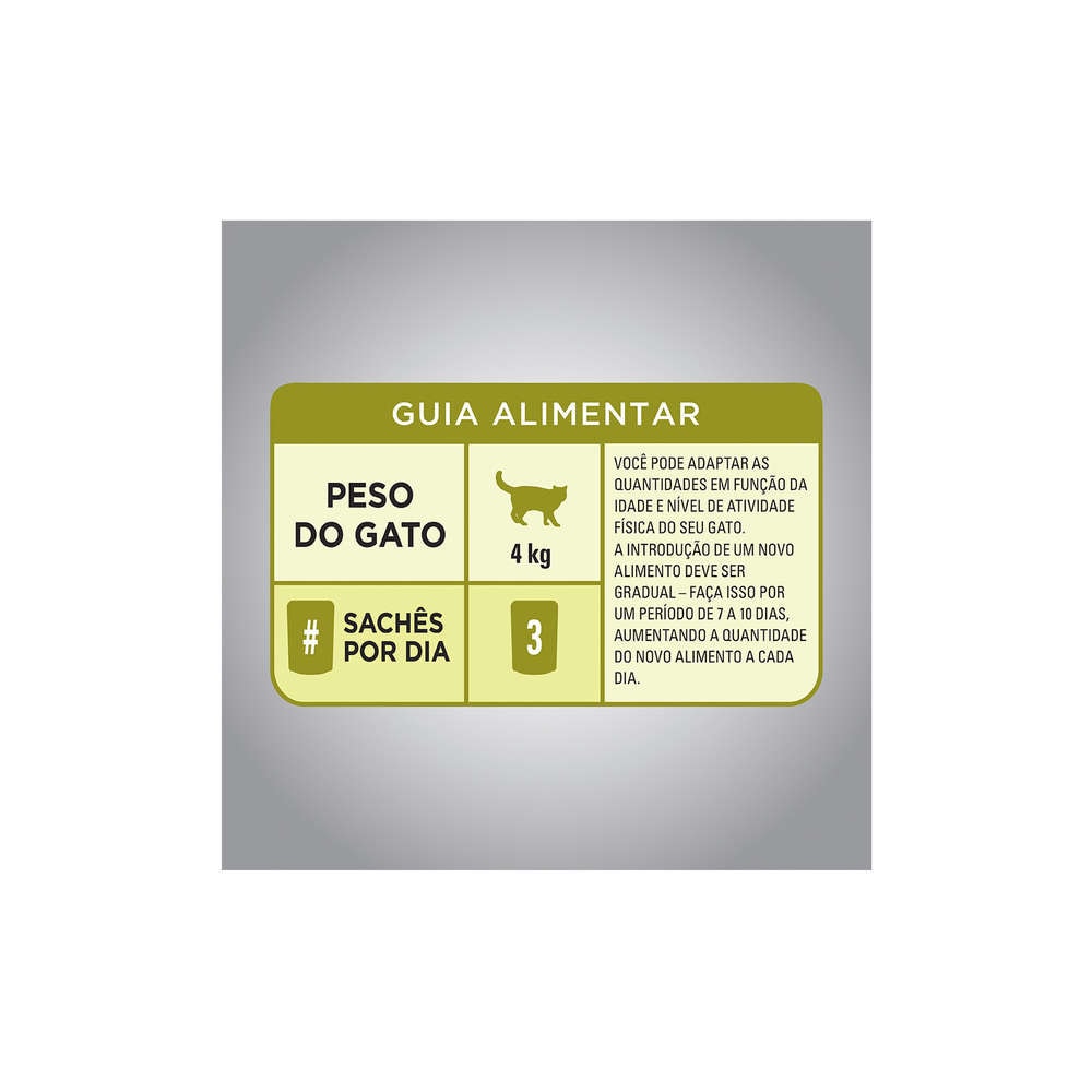 | Composição | Carne mecanicamente separada de frango (mín 3%), miúdos de aves, miúdos de suínos, plasma sanguíneo suíno em pó, farinha de trigo, celulose em pó, água, amido de milho, metionina, taurina, minerais (cloreto de sódio (sal comum), tripolifosfato de sódio, cloreto de potássio, fosfato bicálcico, sulfato de cobre, iodato de cálcio, óxido de zinco, óxido de manganês, selenito de sódio, óxido de magnésio), vitaminas (d3, e, c, b1, b2, b6, b12, cloreto de colina, niacina, ácido pantotênico, ácido fólico), palatabilizante, corante natural caramelo, goma xantana. eventuais substitutivos: miúdos de bovino, gordura de frango, plasma sanguíneo bovino em pó, miúdos de peru, vísceras de frango, polpa de beterraba, glúten de trigo, óleo de girassol degomado, proteína concentrada de soja. | ||||||||||||||||||||||||||||||||