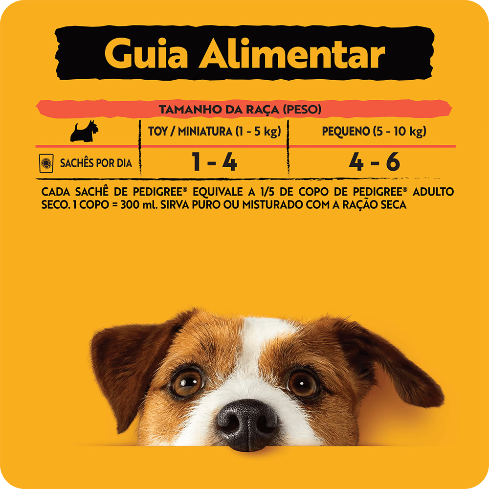 Cada Sachê de PEDIGREE® equivale a 1/5 de copo de PEDIGREE® adulto seco. 1 copo = 300 ml.