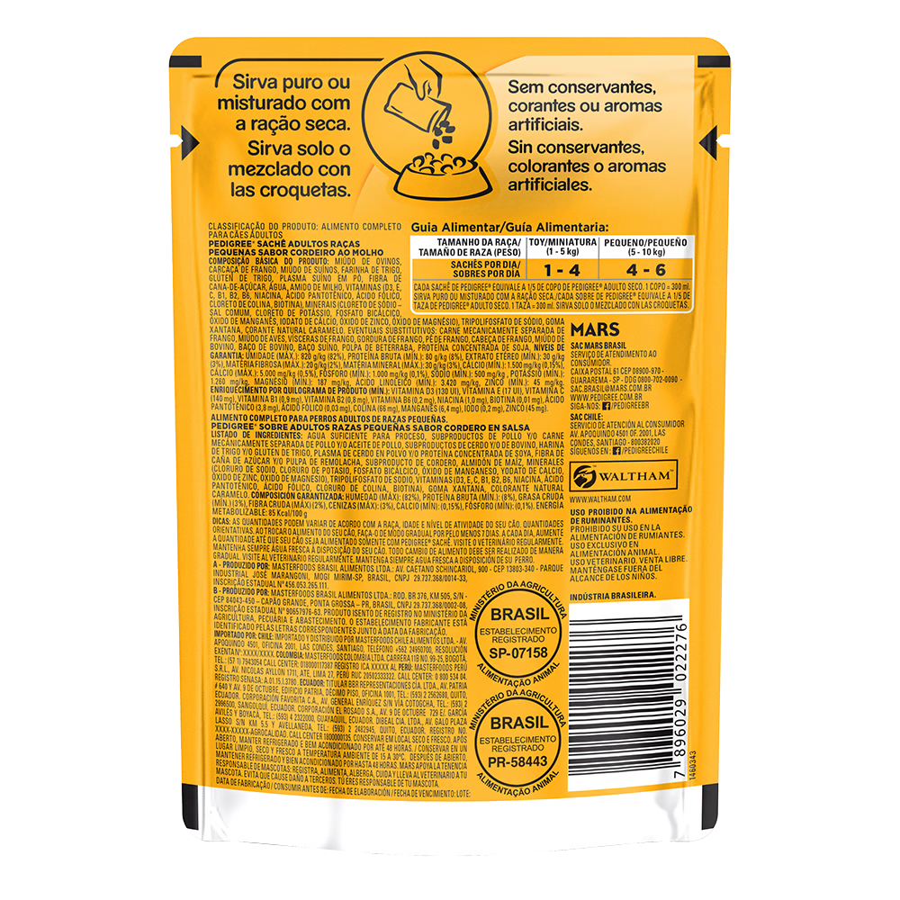 Cada Sachê de PEDIGREE® equivale a 1/5 de copo de PEDIGREE® adulto seco. 1 copo = 300 ml. Sirva puro ou misturado com a ração seca. | |||||||||||||||||||||||||||||||||||||||