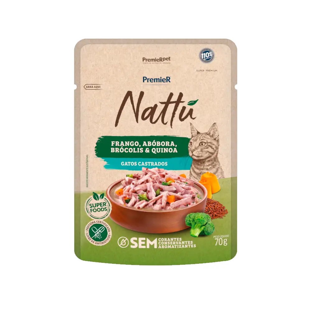 Com o Sachê Premier Nattu, você tem a certeza de estar oferecendo o melhor para o seu gato. Um alimento úmido, saboroso e nutritivo, que vai deixar seu felino mais feliz e saudável.