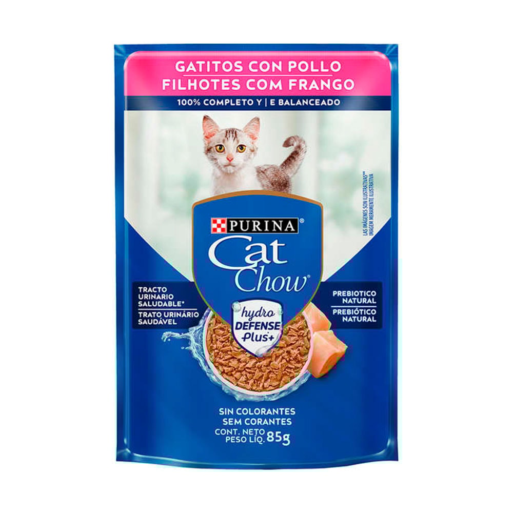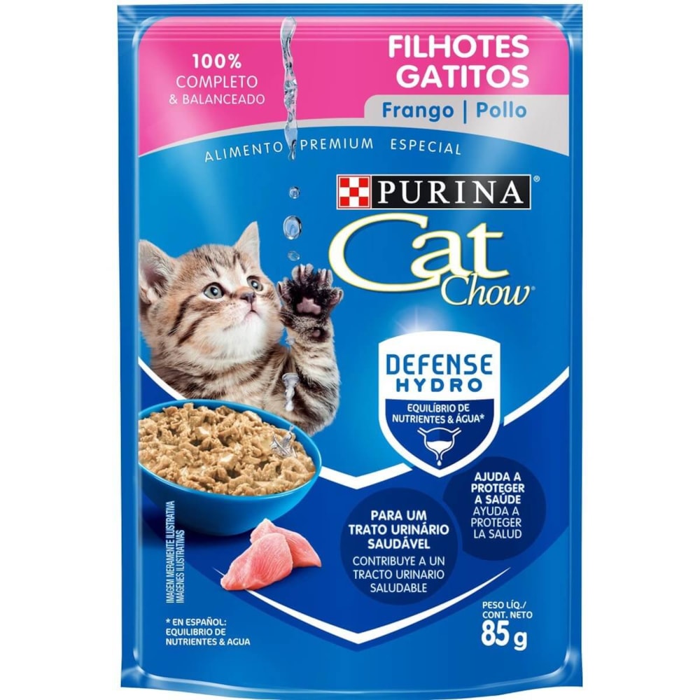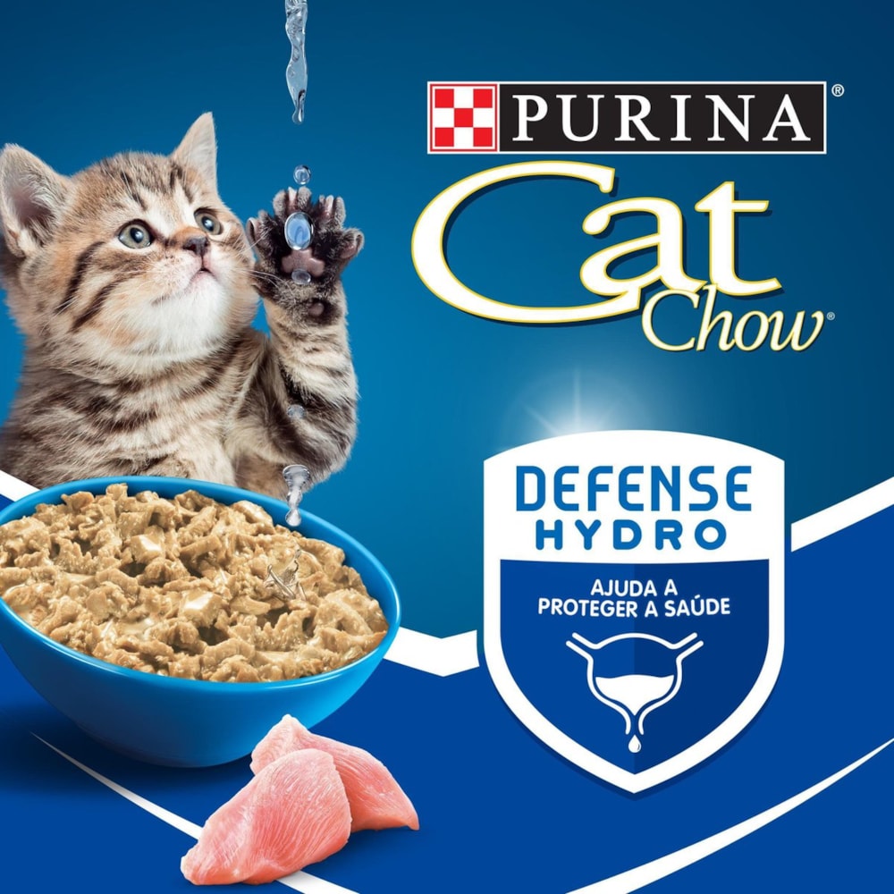 PURINA® CAT CHOW® sabor frango ao molho é um alimento úmido para gatos filhotes. 100% completo e balanceado, tem todos os nutrientes adequados para o seu filhotinho, por isso não é necessário complementar com ração seca. Possui frango em pedaços cozidos no vapor com um molho rico em proteínas e vitaminas. Tem também a tecnologia Defense Hydro, que acompanha água em sua fórmula e apresenta um equilíbrio entre os nutrientes. Por meio do alimento úmido, que tem 80% de água, é possível aumentar a ingestão hídrica pelo pet, aumentando a saudabilidade do trato urinário.