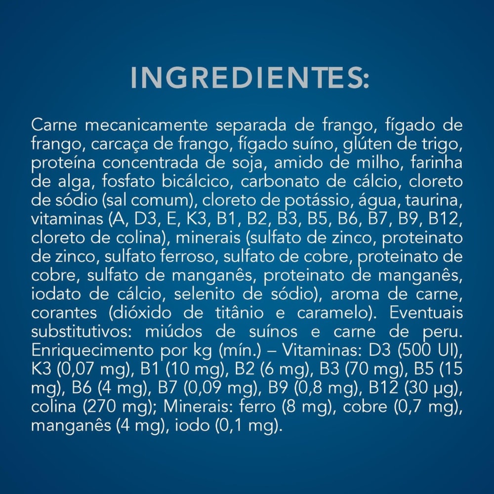 carne mecanicamente separada de frango (1%), fígado suíno, resíduo de salmão, glúten de trigo, proteína concentrada de soja, amido de milho, fosfato bicálcico, cloreto de sódio (sal comum), dextrose, cloreto de potássio, carbonato de cálcio, água, glicina, inulina, taurina, vitaminas (A, D3, E, K3, B12, B1, B2, B6, niacina, biotina, ácido fólico, pantotenato de cálcio, cloreto de colina), minerais (sulfato de zinco, sulfato ferroso, sulfato de manganês, sulfato de cobre, proteinato de zinco, proteinato de ferro, proteinato de manganês, proteinato de cobre, proteinato de selênio, iodato de cálcio, selenito de sódio). Eventuais Substitutivos: fígado de frango, miúdos de suínos, farinha de vísceras de aves, carcaça de frango.