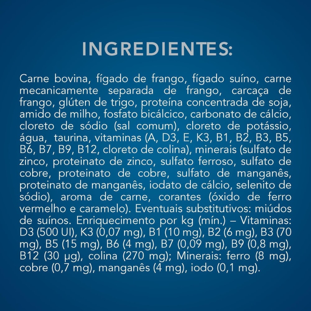 carne mecanicamente separada de frango, carne bovina (1%), fígado suíno, pulmão bovino, resíduo de salmão, glúten de trigo, proteína concentrada de soja, amido de milho, fosfato bicálcico, cloreto de sódio (sal comum), dextrose, cloreto de potássio, carbonato de cálcio, água, glicina, inulina, taurina, vitaminas (A, D3, E, K3, B12, B1, B2, B6, niacina, biotina, ácido fólico, pantotenato de cálcio, cloreto de colina), minerais (sulfato de zinco, sulfato ferroso, sulfato de manganês, sulfato de cobre, proteinato de zinco, proteinato de ferro, proteinato de manganês, proteinato de cobre, proteinato de selênio, iodato de cálcio, selenito de sódio).