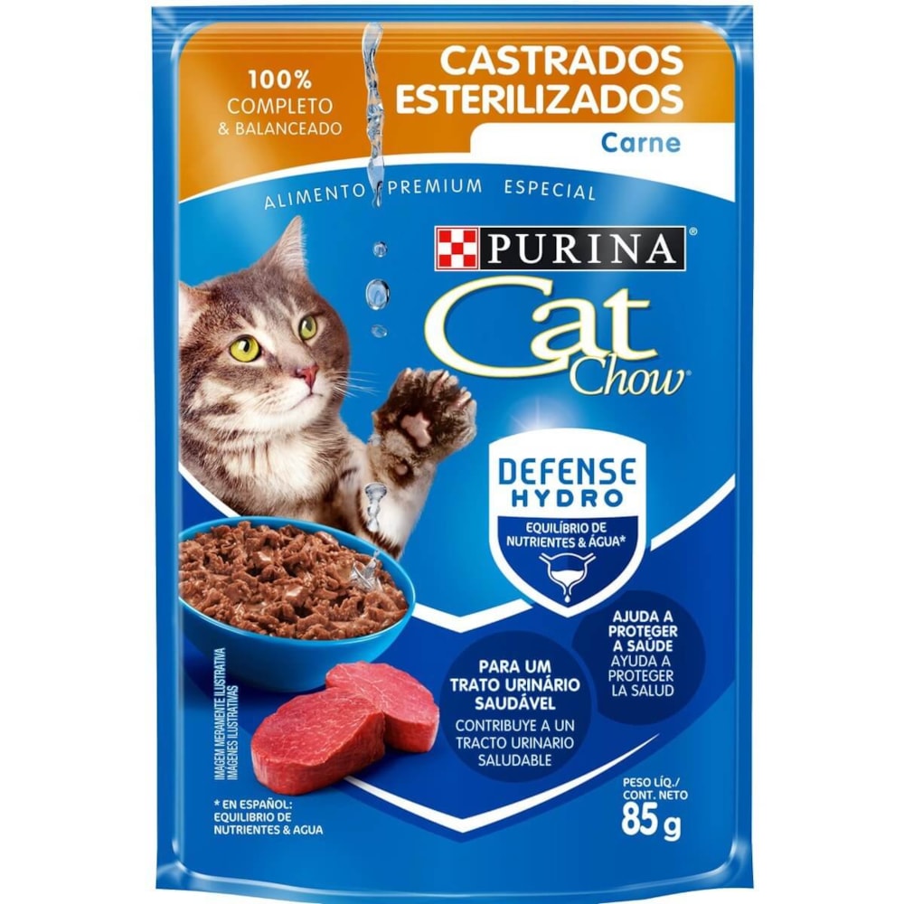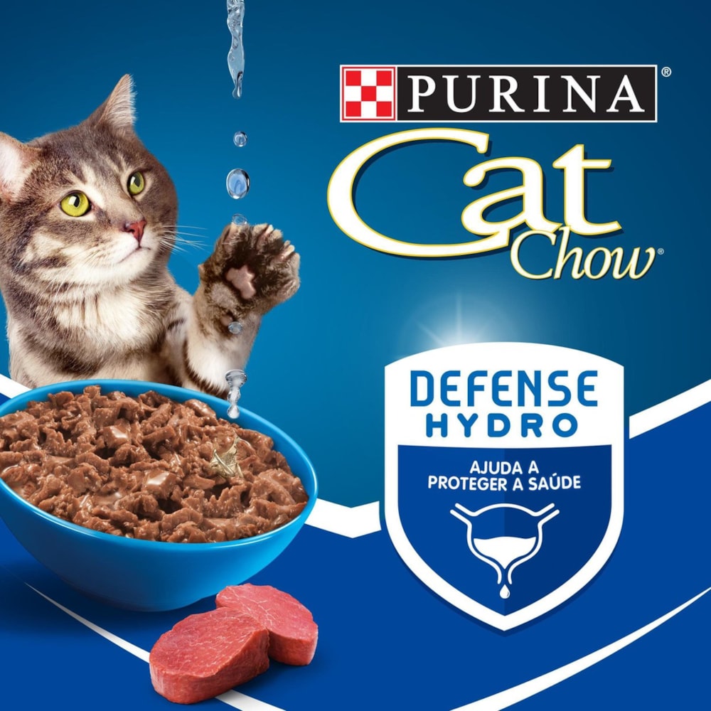 PURINA® CAT CHOW® sabor carne ao molho é um alimento úmido para gatos castrados. 100% completa e balanceada, a ração auxilia na manutenção o peso do seu gato e tem todos os nutrientes adequados para ele, por essa razão não é necessário complementar com a ração seca. Possui carne em pedaços cozidos no vapor com um molho rico em proteínas e vitaminas. Tem também a tecnologia Defense Hydro, que acompanha água em sua fórmula e apresenta um equilíbrio entre os nutrientes.