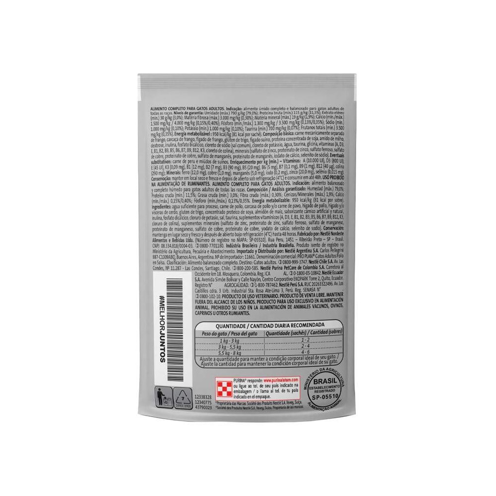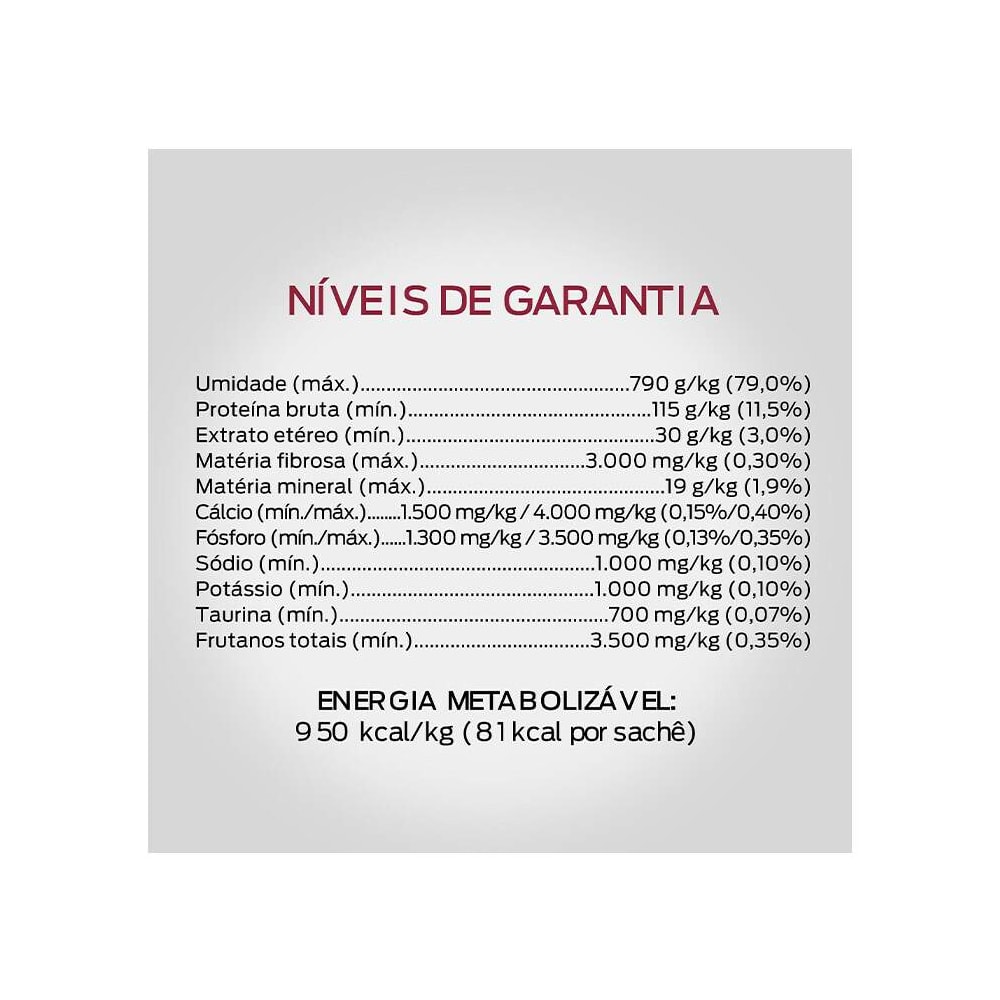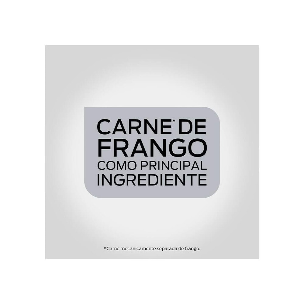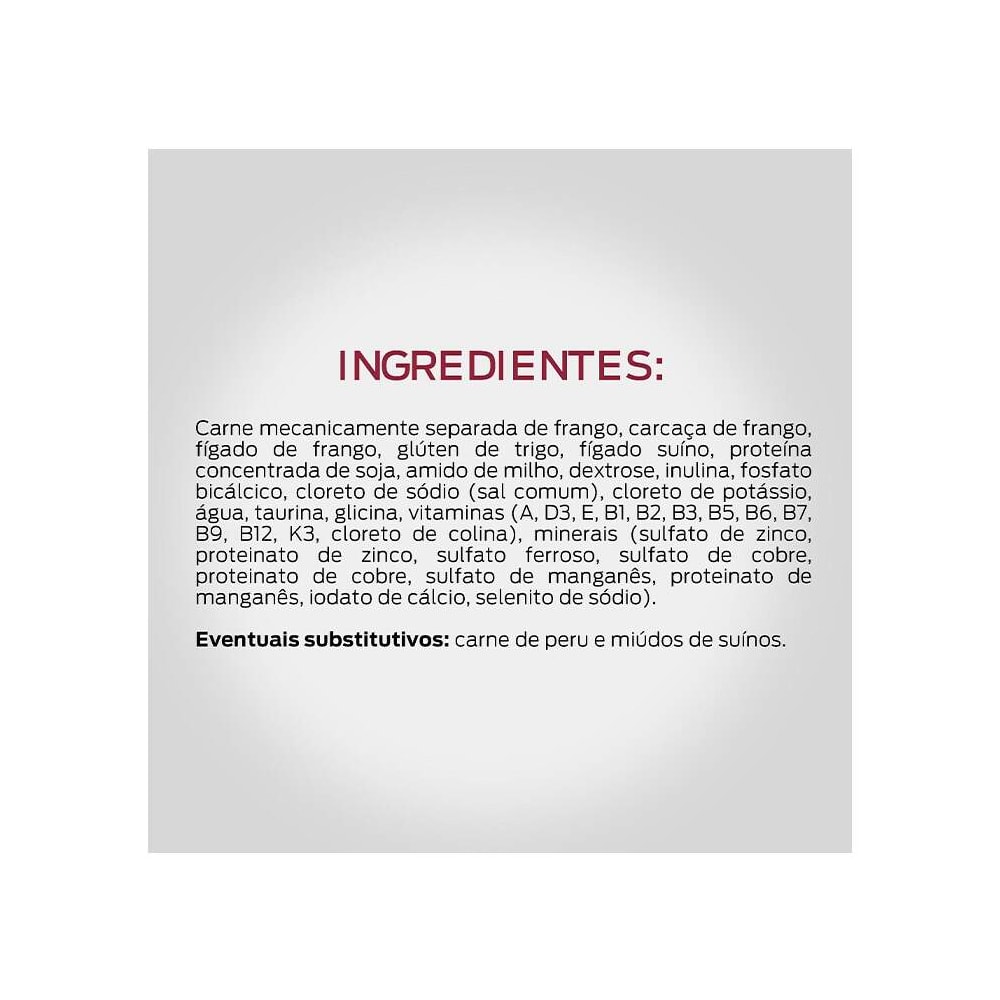 Carne de frango, carne mecanicamente separada de frango, fígado de frango, carcaça de frango, fígado suíno, glúten de trigo, proteína concentrada de soja, amido de milho, inulina, cloreto de sódio (sal comum), fosfato bicálcico, carbonato de cálcio, cloreto de potássio, água, vitaminas (A, D3, E, B1, B2, B3, B5, B6, B7, B9, B12, cloreto de colina), minerais (sulfato de zinco, proteinato de zinco, sulfato ferroso, sulfato de cobre, proteinato de cobre, sulfato de manganês, proteinato de manganês, iodato de cálcio, selenito de sódio). Eventuais substitutivos: miúdos suínos e carne de peru.