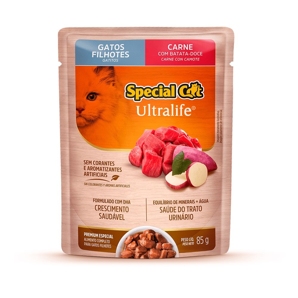 Alimento úmido, completo e balanceado para gatos filhotes. Special Cat Sachê Gatos Filhotes Sabor Carne ao Molho é uma excelente combinação de saborosos pedaços macio, cozidos a vapor, com um suculento molho especial. O seu bichano vai adorar!