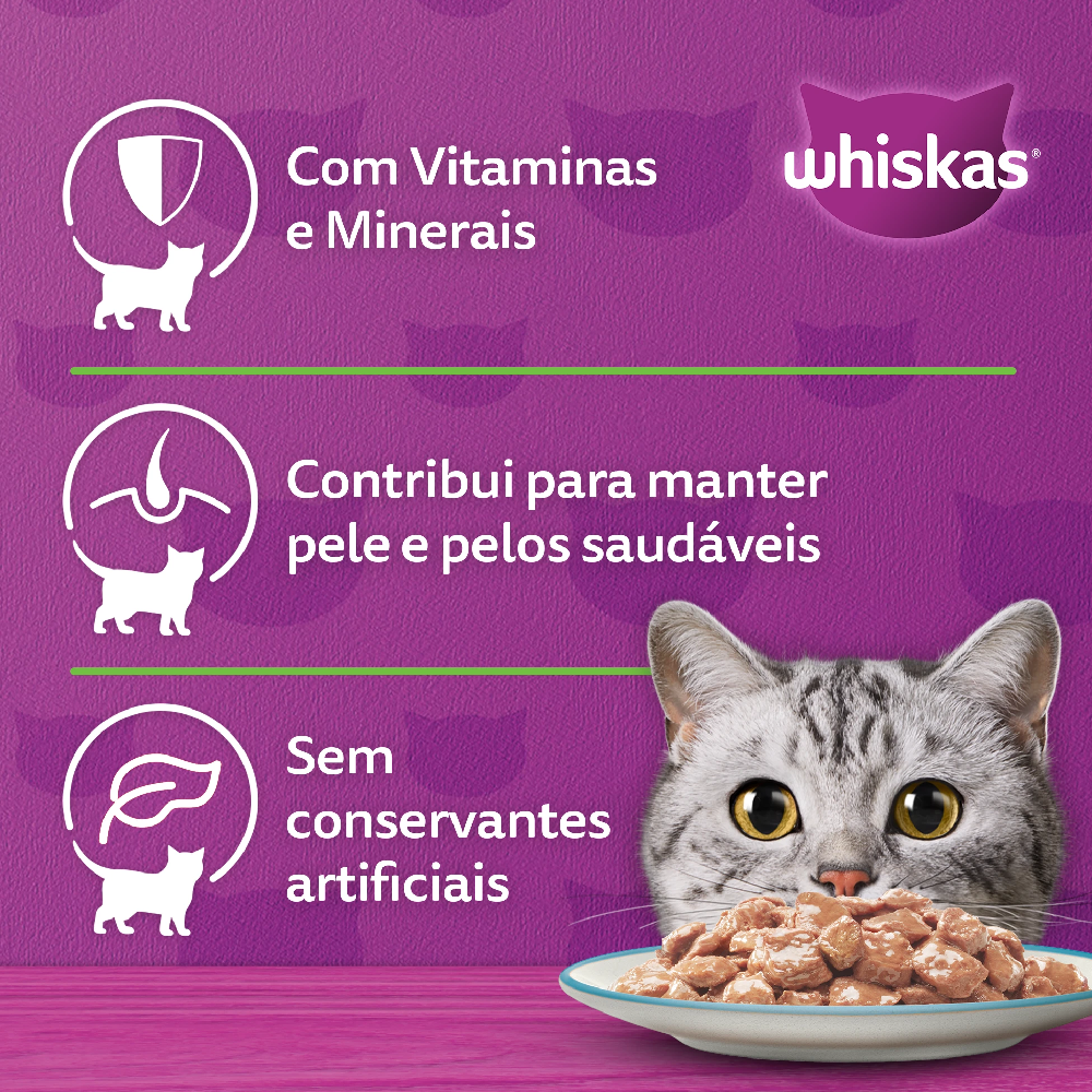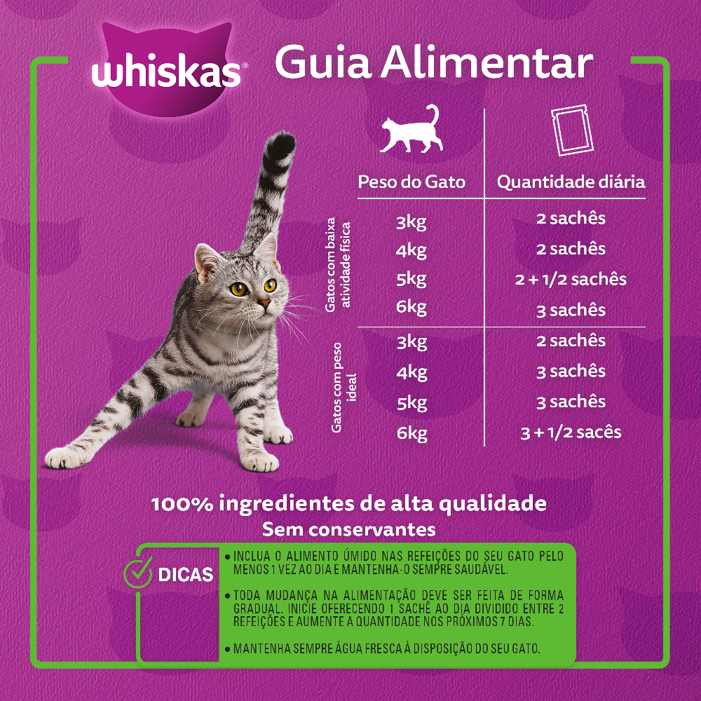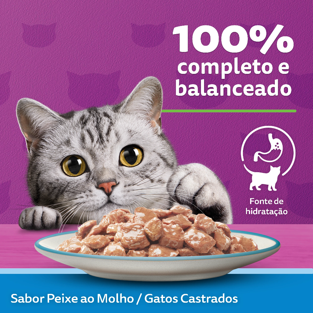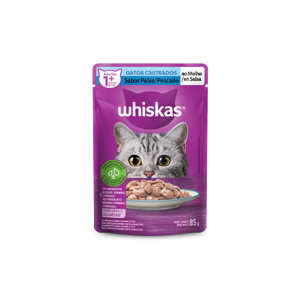 O Sachê Whiskas para Gatos acima de 1 ano Castrados sabor Peixe ao Molho apresenta uma refeição completa que deve ser servida todos os dias em cada período da vida do seu felino, sempre mantendo a sua saúde.