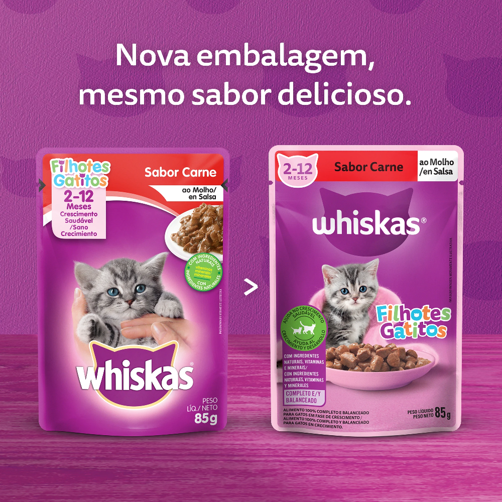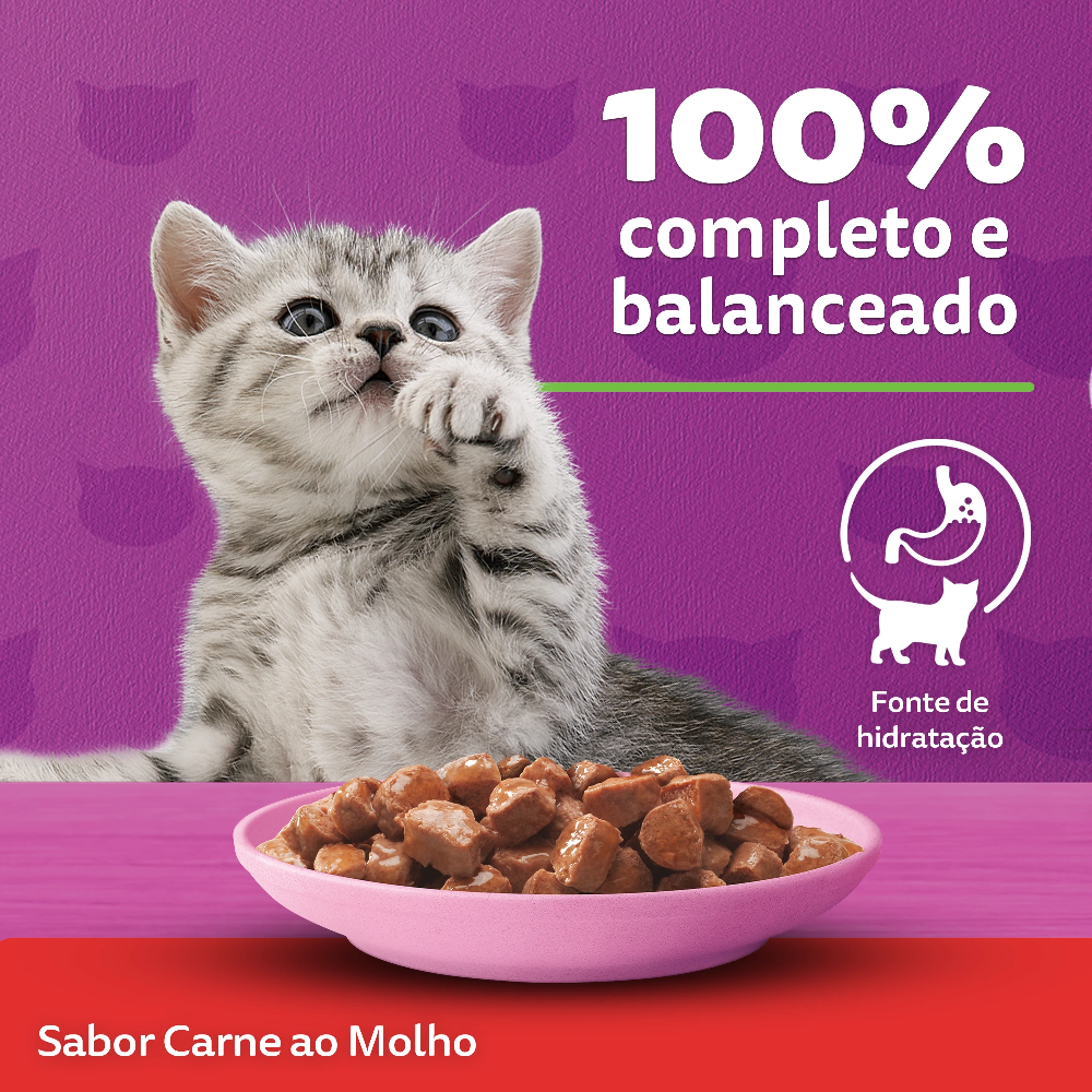 O Sachê Whiskas para Gatos Filhotes de 2 a 12 Meses sabor Carne ao Molho foi desenvolvido cuidadosamente com ingredientes de alta qualidade, garantindo os nutrientes que eles precisam todos os dias, agora com um molho mais encorpado.