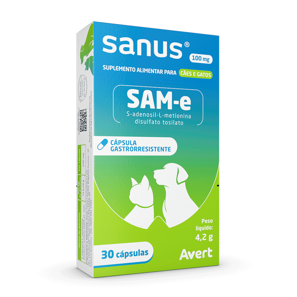 SANUS® 100 mg é um suplemento alimentar formulado com S-adenosil-L-metionina (SAMe), um composto amplamente reconhecido por seu papel no suporte ao metabolismo celular, à função hepática e ao equilíbrio geral do organismo. Indicado para cães e gatos de qualquer idade, o produto é recomendado para animais que podem se beneficiar do aporte desse nutriente essencial.