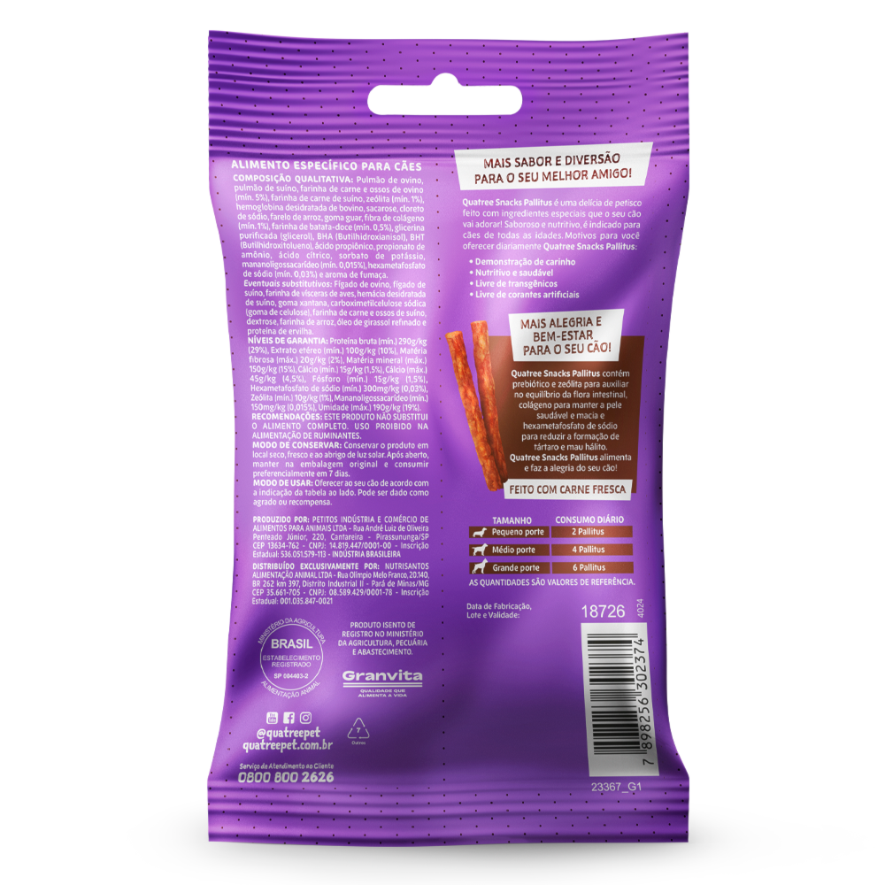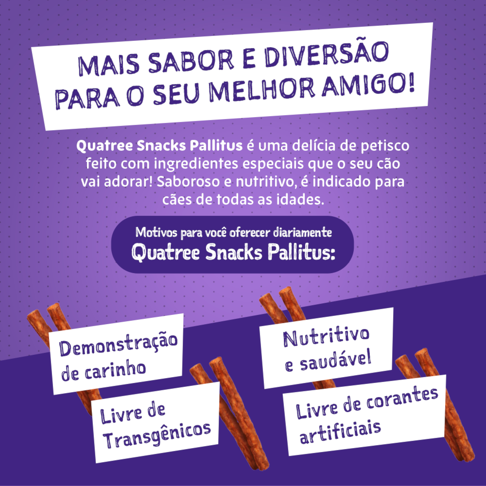 Com a combinação perfeita de sabor e textura, o Quatree Pallitus é muito mais que um simples petisco: é uma recompensa deliciosa que fortalece o vínculo entre você e seu melhor amigo.