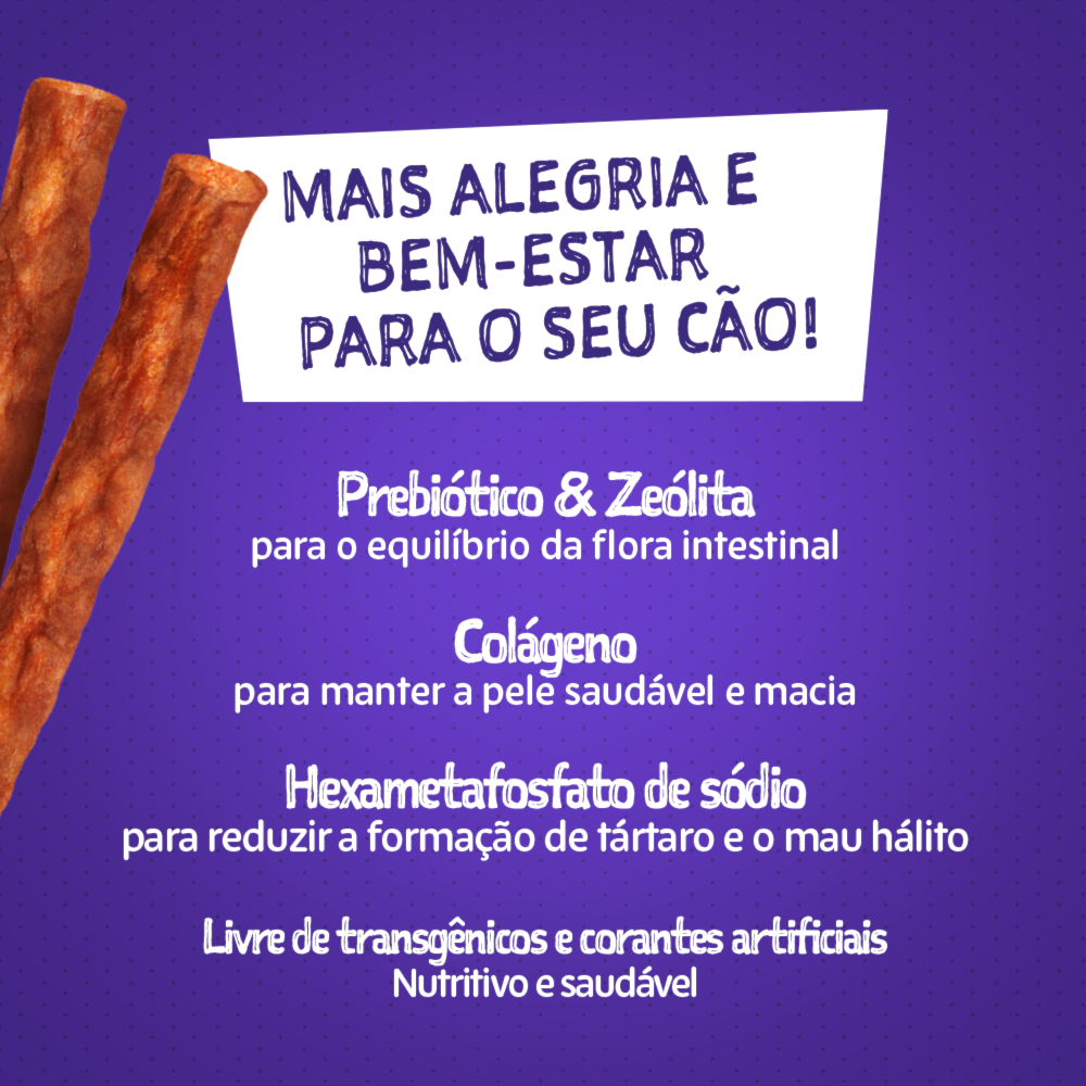 Modo de usar: Oferecer como recompensa ou como petisco. A quantidade recomendada varia de acordo com o tamanho e peso do seu cão.