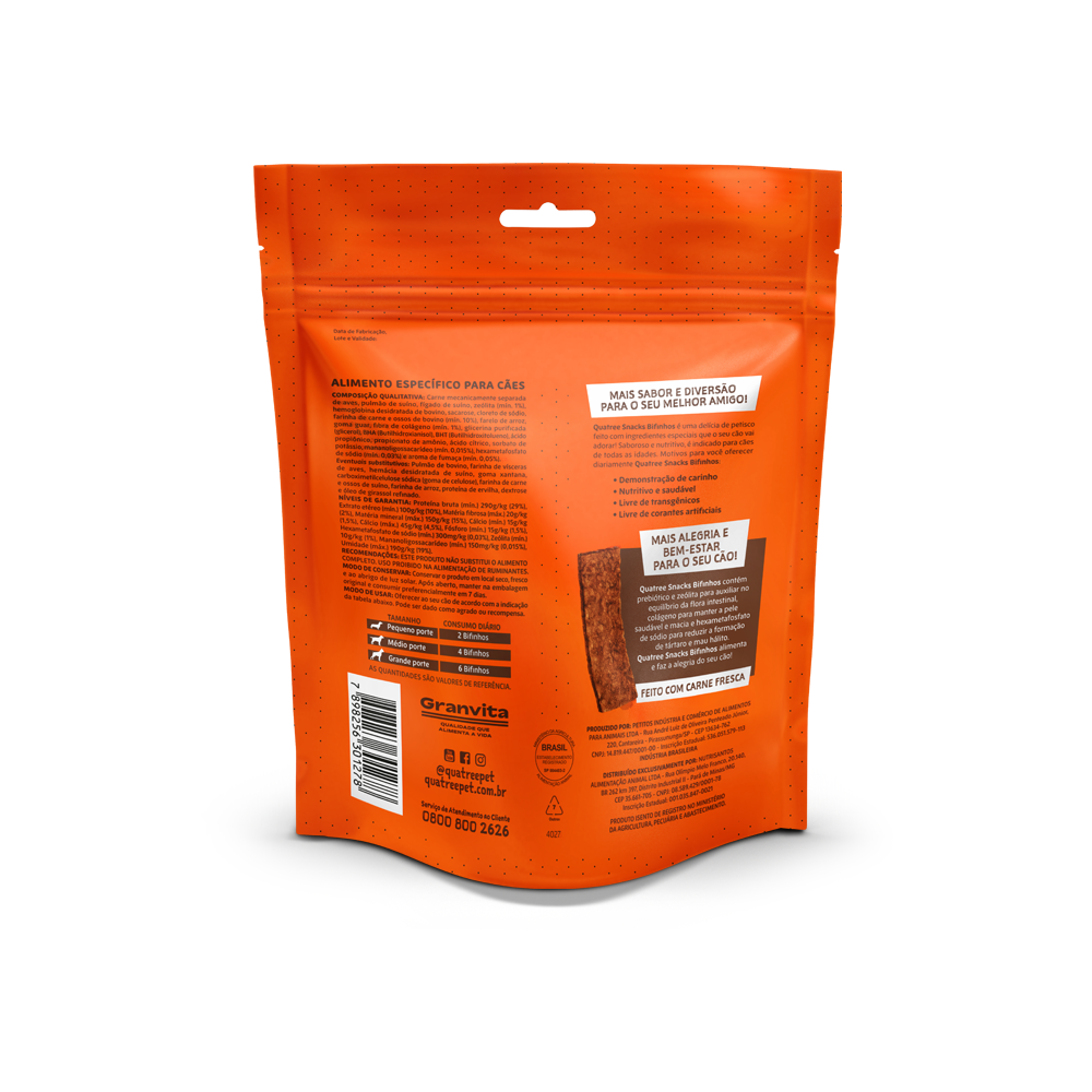 Dica: Para um momento ainda mais especial, aqueça os Bifinhos Quatree Snacks Sabor Carne levemente antes de oferecer ao seu cãozinho. O aroma irresistível vai deixá-lo ainda mais ansioso para saborear essa delícia!
