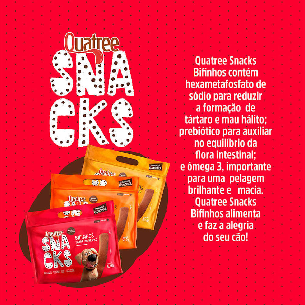 Com 60g de sabor churrasqueiro e nutrição completa, os Bifinhos Quatree Snacks Sabor Churrasco são o presente perfeito para seu cãozinho!