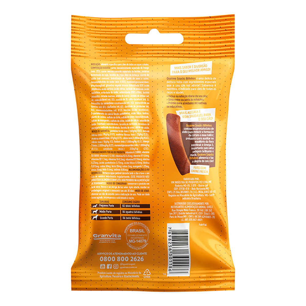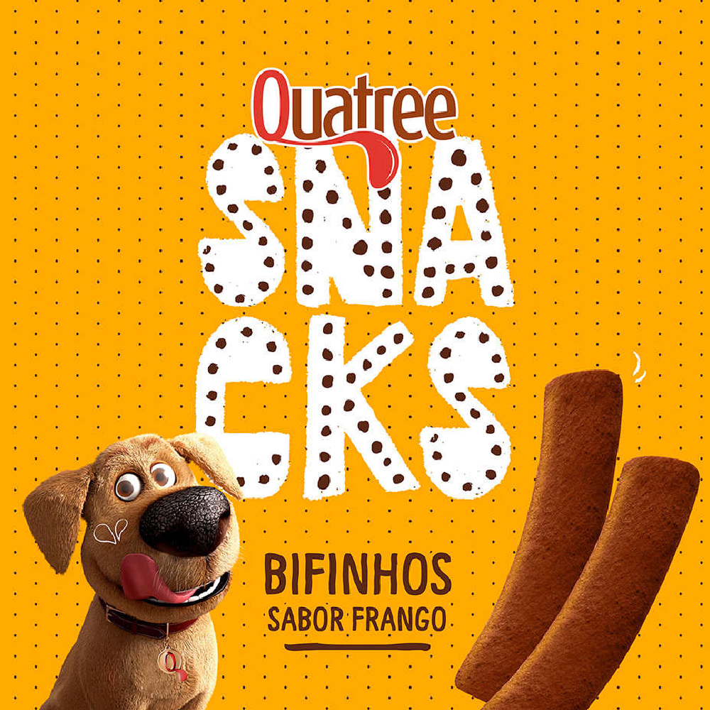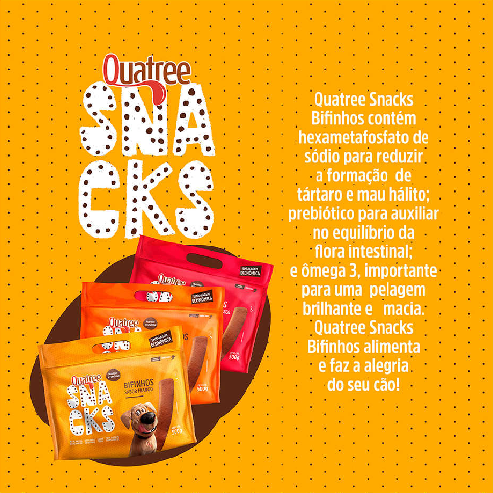Com 60g de sabor e nutrição, os Bifinhos Quatree Snacks Sabor Frango são a escolha ideal para presentear seu cãozinho com um petisco delicioso e saudável que ele vai adorar!