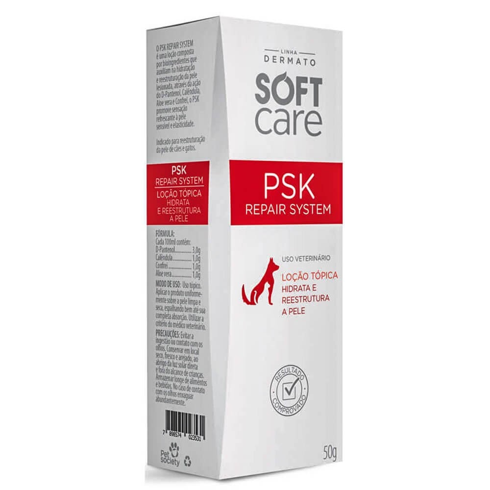 A Loção Pet Society Soft Care PSK Repair System foi desenvolvida para tratar pele machucada de cães e gatos, ou para obter uma hidratação restaurando assim a pele lesionada e também trazendo frescor e aumentando a elasticidade da pele pois contém D-Pantenol e os extratos de Calêndula, Aloe Vera e Confrei. A mesma possui pH balanceado.