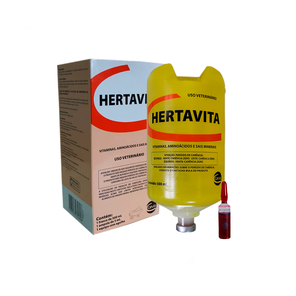 O Hertavita da Ceva é uma solução injetável contendo vitaminas, aminoácidos e minerais para uso em bovinos nas situações de desidratação e enfraquecimento geral, no pré e pós-operatório, na acetonemia, no esgotamento físico e como adjuvante no tratamento de doenças infecciosas.
