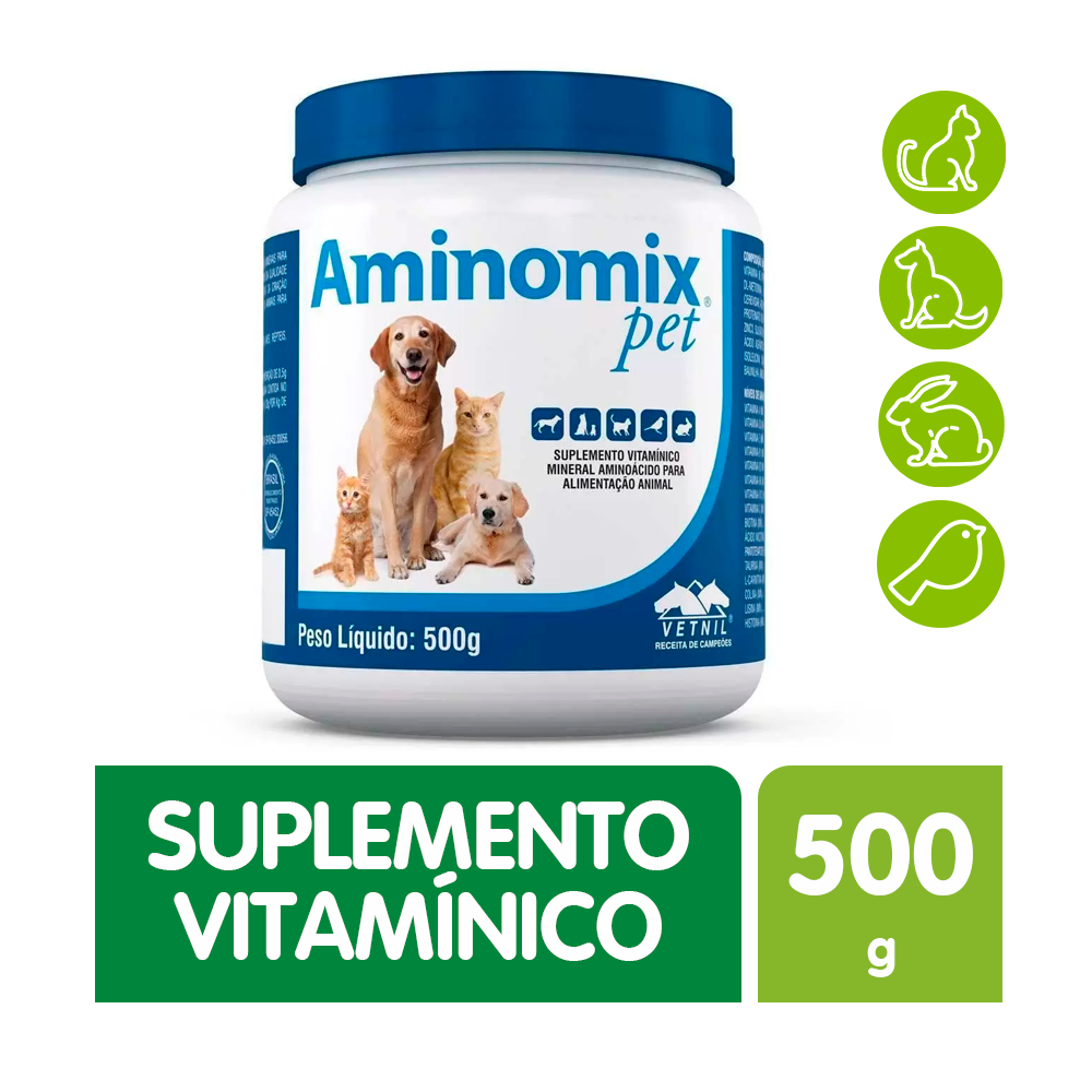 Aminomix Pet auxilia na melhora da qualidade nutricional dos alimentos (rações, farinhadas, misturas de sementes ou comida caseira), fornecendo as doses essenciais de vitaminas, minerais e aminoácidos, de forma que a criação possa expressar o seu melhor.