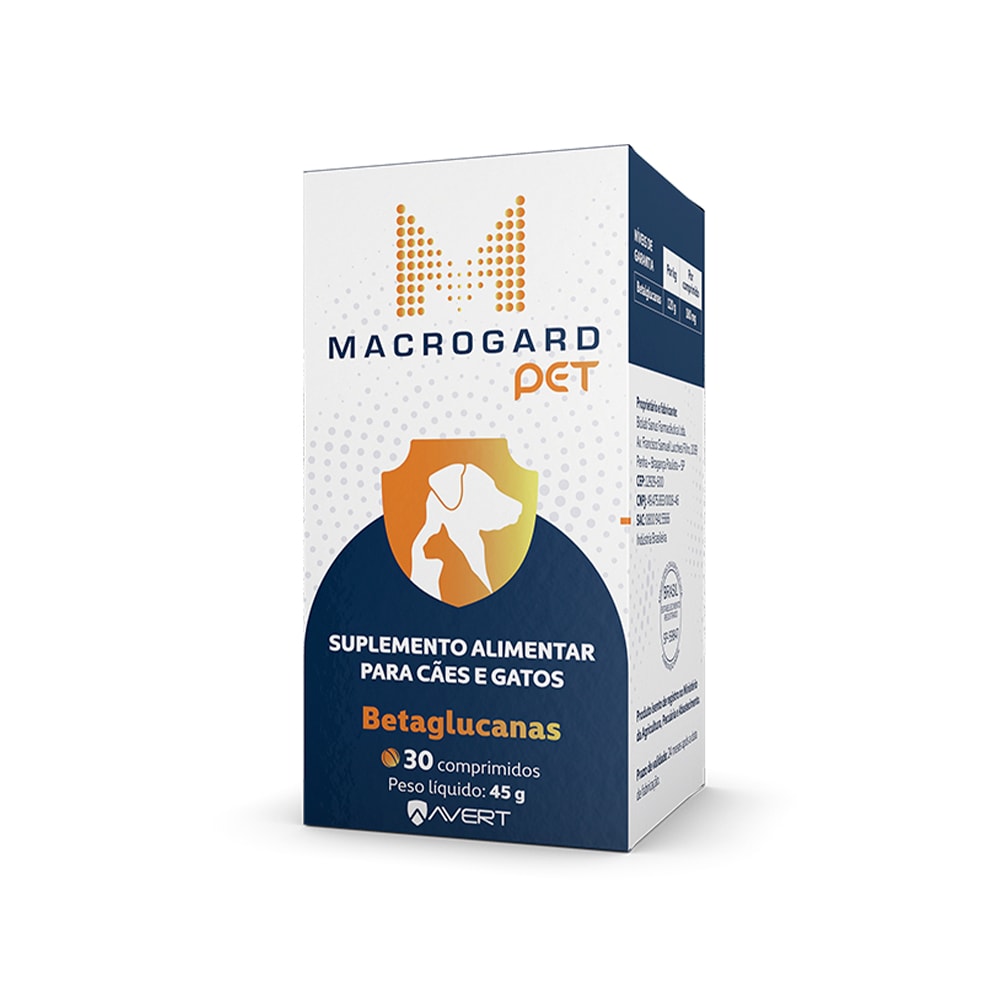 - Disponível em embalagem com 30 comprimidos. Indicação Indicado para o suporte ao sistema imunológico de cães e gatos em qualquer idade que se beneficiem do aporte desse nutriente. EspecificaçõesComposição MACROGARD PET é um suplemento nutricional composto por betaglucanas (ß-1,3/1,6 glucanas) purificadas da levedura Saccharomyces cerevisae. Posologia e modo de uso Administrar, por via oral 1, comprimido para cada 12 kg de peso corporal 1 vez ao dia ou de acordo com a indicação do profissional responsável pela nutrição de seu animal. Você já conhece a Agrosolo?Código de Barras 7896112402701