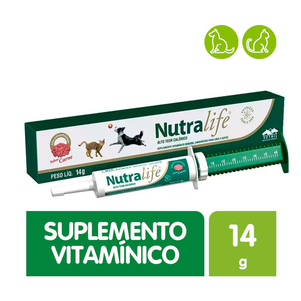 Nutralife é um suplemento rico em calorias utilizado para o rápido aporte nutricional de pequenos animais. Contém macro e microminerais, vitaminas hidro e lipossolúveis, aminoácidos essenciais e não-essenciais, Ômegas 3 e 6, Glicose, Prebióticos (MOS e FOS). A apresentação em pasta e o sabor carne conferem ótima aceitação e favorecem a absorção dos nutrientes da fórmula, sendo, portanto, um produto fundamental no caso de animais que necessitam de apoio nutricional imediato e eficaz.