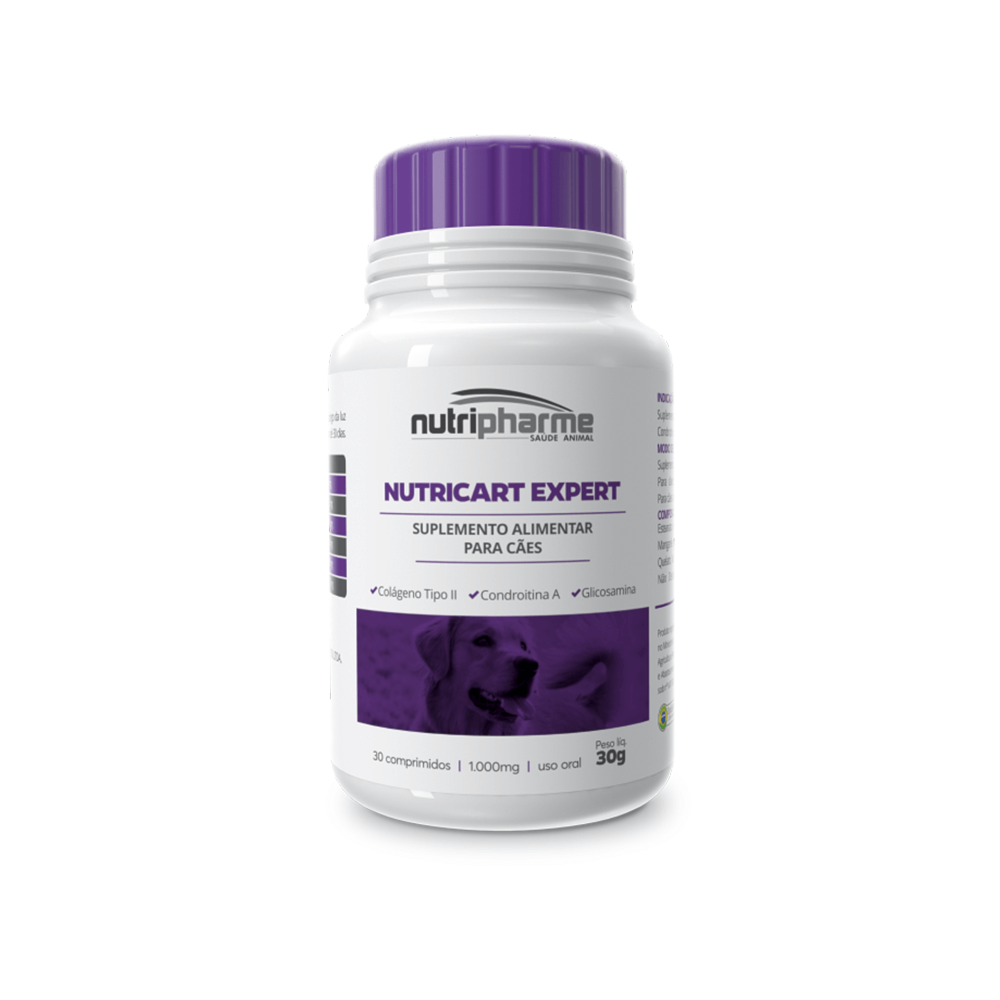 O Nutricart Expert Suplemento Alimentar para Cães 1000mg de 30 Comprimidos é um suplemento alimentar para cães de todas as idades com sulfato de Condroitina, Glucosamina e Colágeno Tipo II Não Desnaturado.