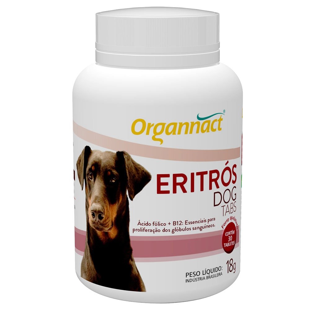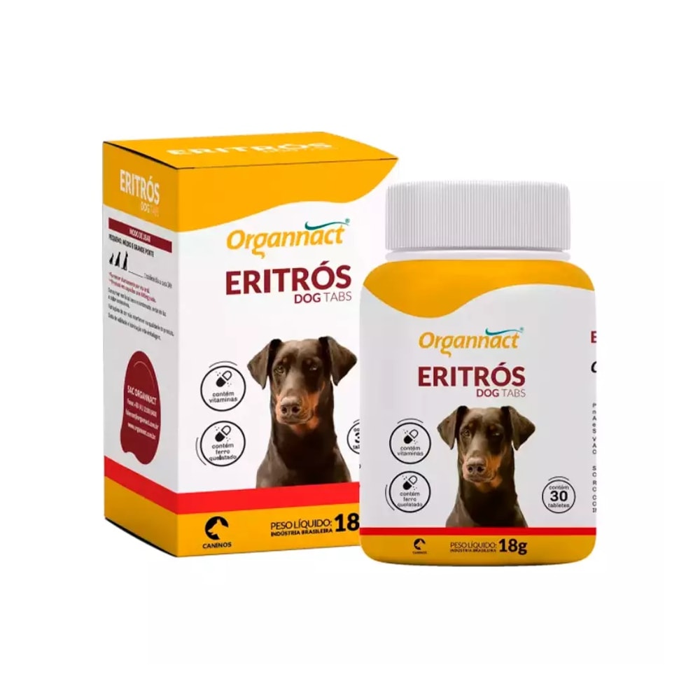 ERITRÓS DOG TABS é um Suplemento Vitamínico Aminoácido para cães composto por ácido Fólico, Piridoxina (vitamina B6), Cianocobalamina (vitamina B12), Ferro quelatado e DL-metionina.