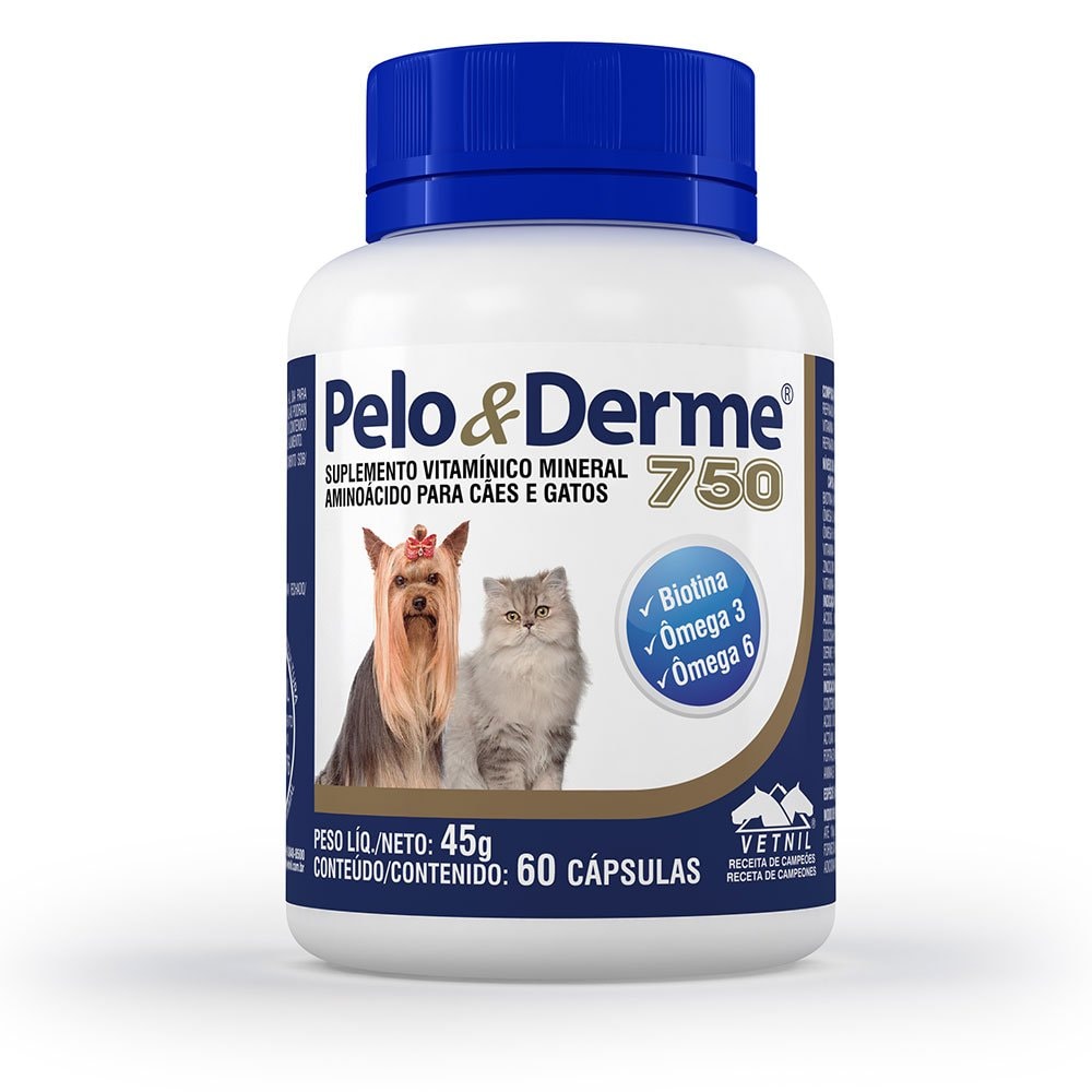 O Suplemento Mineral Vitamínico Pelo & Derm 750 (60 cápsulas) da Vetnil possui uma fórmula moderna e equilibrada que contém os principais ácidos graxos essenciais à dieta dos pequenos animais, associados à Biotina, Zinco, Vitamina A e Vitamina E, elementos que, quando associados, atuam mantendo ideais as características morfológicas, plásticas e funcionais da pelagem e da pele.
