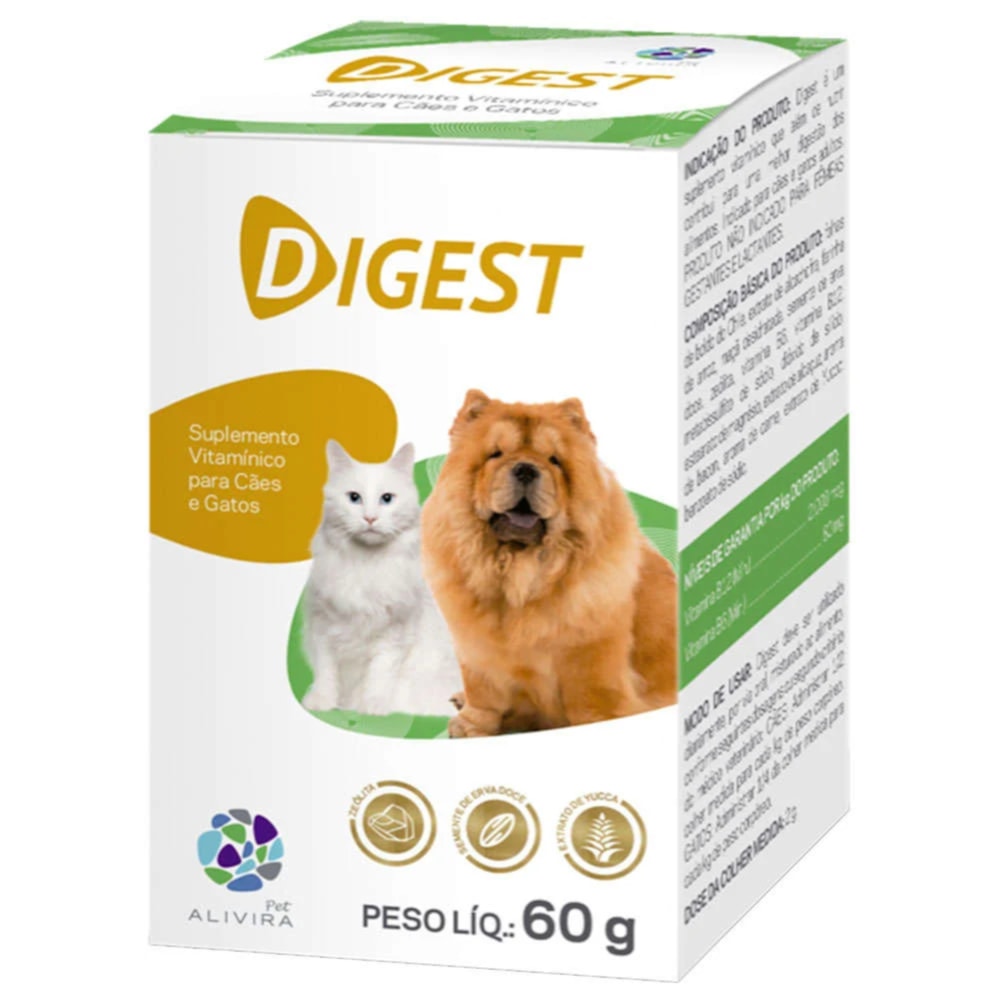 Digest 60g é indicado para cães e gatos de todas as idades e raças que apresentam problemas digestivos como gases, diarreia, constipação, má digestão e absorção de nutrientes.