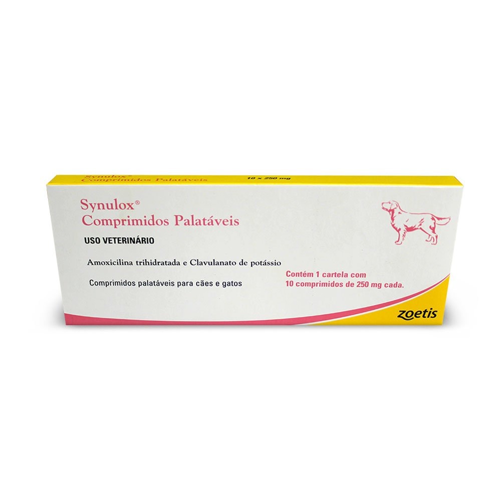 O Antibiótico Zoetis Synulox 10 Comprimidos, apresenta um amplo espectro de atividade, atuando contra bactérias Gram-positivas e Gram-negativas (inclusive cepas produtoras de betalactamases). Tal característica, associada a excelente distribuição e persistência da associação amoxicilina/ácido clavulânico no organismo animal, permitem a utilização do medicamento nos variados processos infecciosos de cães e gatos. Perfeito para tratamento de processos infecciosos, tais como: Infecções cutâneas, respiratórias, do trato gastrintestinal, periodontais, genitourinárias e outros tecidos moles tais como piodermites, dermatites, abscessos e feridas infectadas.