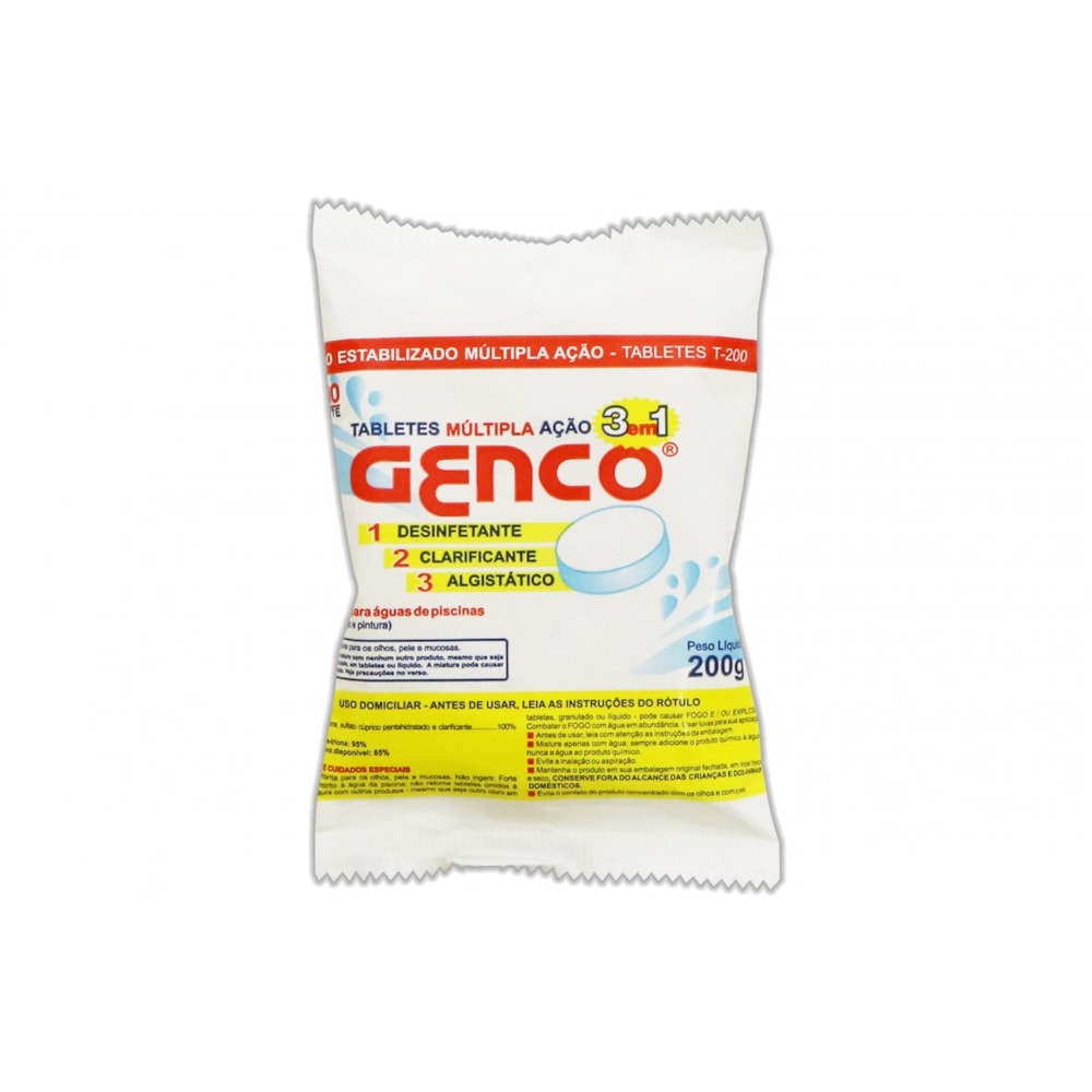 Produto concentrado, contém 85% de cloro ativo. Possui estabilizante que inibe a degradação do cloro pelos raios UV (raios solares). GENCO® TABLETES MÚLTIPLA AÇÃO "3 em 1" apresenta dissolução lenta para cloração contínua e automática. Sua fórmula múltipla ação é recomendada especialmente para quem quer praticidade aliada à qualidade. Poderoso desinfetante (cloro com estabilizante), clarificante, algicida e algistático. Indicado para piscinas residenciais.